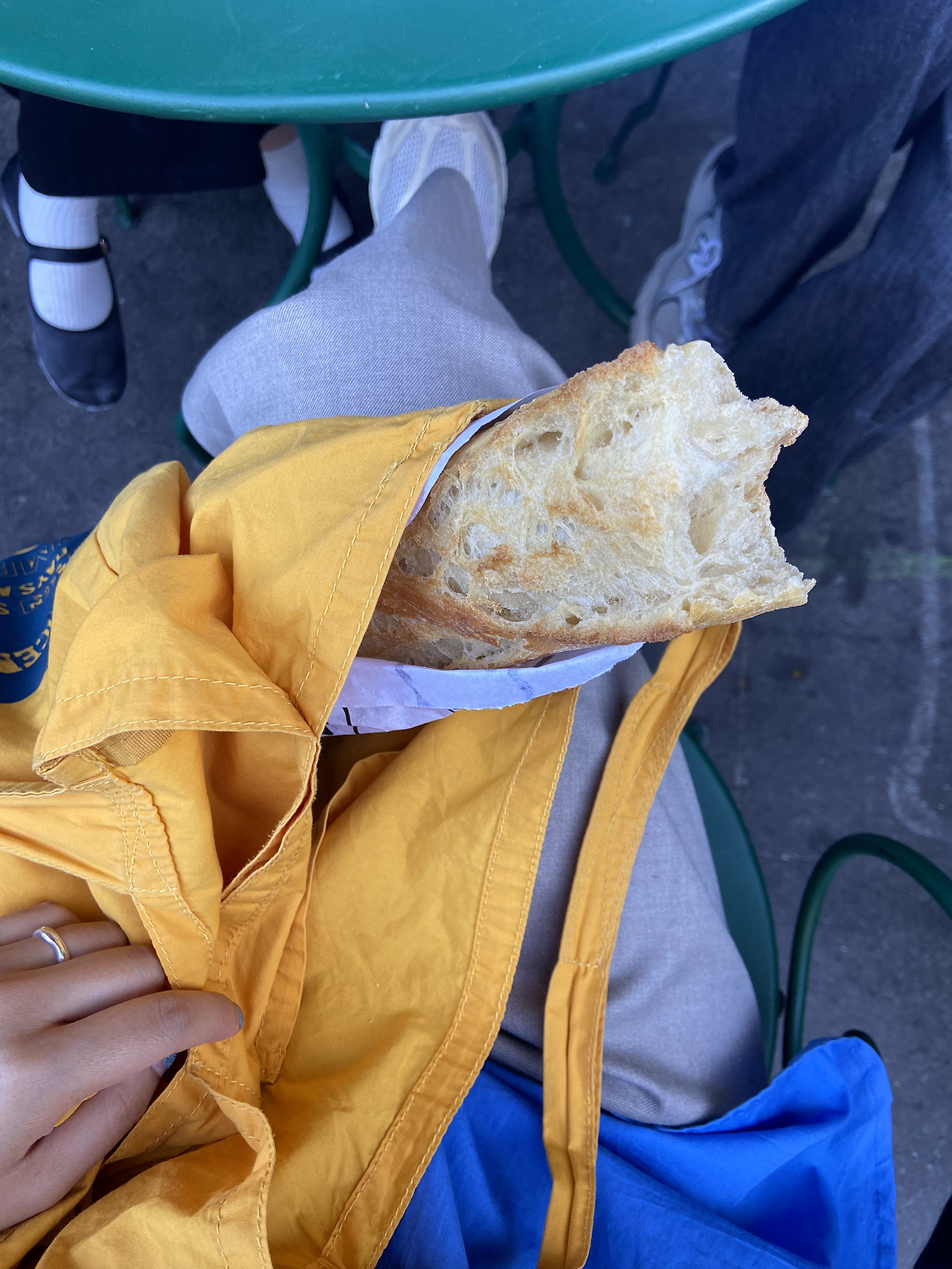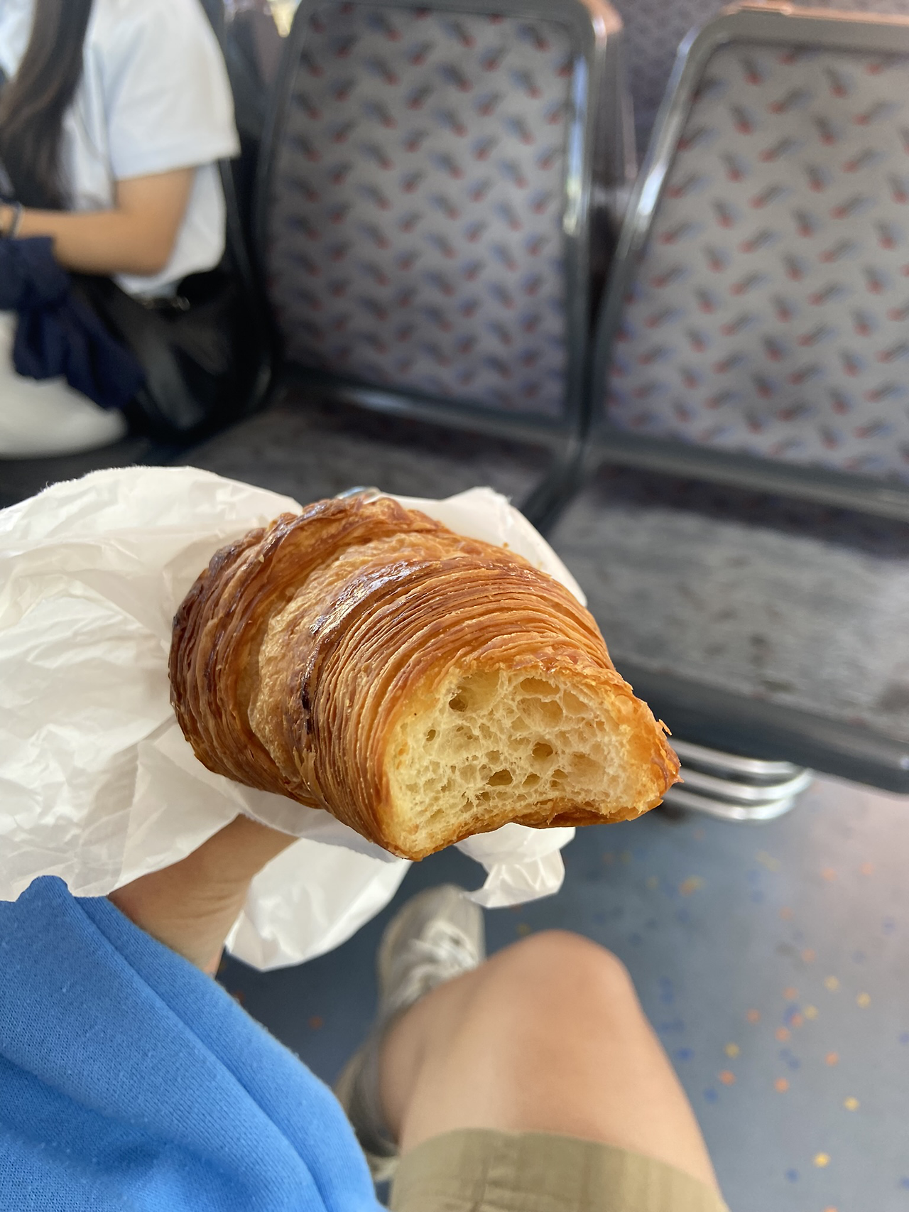 무려 디즈니랜드를 가는 길이었거든요. 그런데 소화가 다 되기도 전에 길거리에 있는 로컬 빵집을 발견해버린 거예요. 안 그래도 버스에서 잘못 내려서 새로운 길이라 정보도 없는데, 무척이나 설레하면서 크로와상을 하나 달라고 말했습니다. 그런데 어째서인지 나와보니까 빵이 세 개인 거예요. 저희가 세 명이라 그냥 한 사람에 하나씩 먹겠거니, 하고 세 개를 넣어주셨나 봅니다. 돈은 냈지만 횡재했다고 생각하며 아침부터 거나하게 즐기게 됐어요.