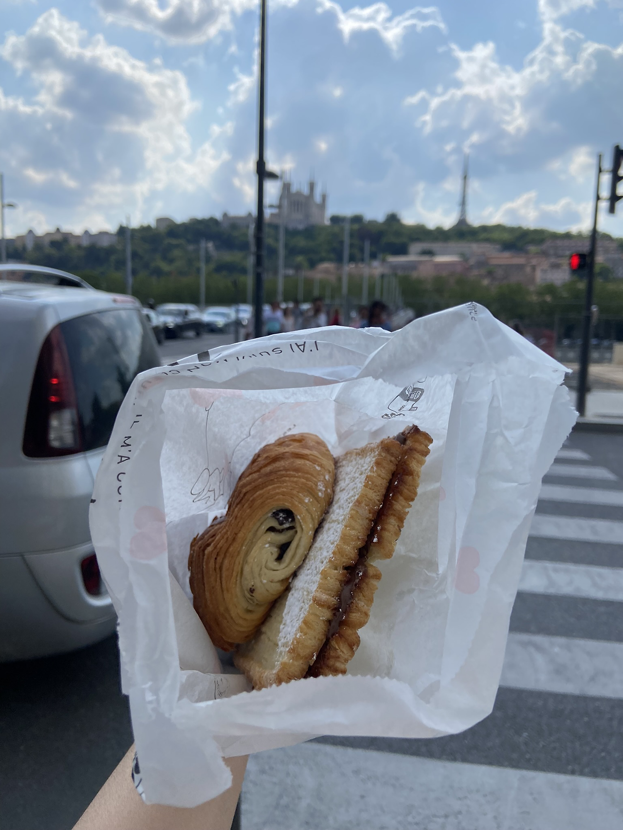 리옹에서 맛있는 빵집을 찾기가 꽤 어려웠던 것 같아요. 정보가 별로 없어서요. 리옹이 미식의 도시라고는 들었거든요. 그러니 아무 빵집이나 가도 괜찮을 것 같았어요. 찾아둔 빵집이 없어졌길래, 바로 근처에 있는 곳을 향했습니다. 다시 찾아보니 제가 가려던 곳이 맞네요. 아주 젊은 청년이 더위 속에서 빵을 팔고 있었는데요. 크로와상이 없어서 누텔라를 샌드한 빨미까레와, 뺑오쇼콜라를 하나 사 먹었어요. 뺑오는 그럭저럭 괜찮았고, 빨미까레는 얼려서 다음날 먹었는데 너무 맛있었어요.