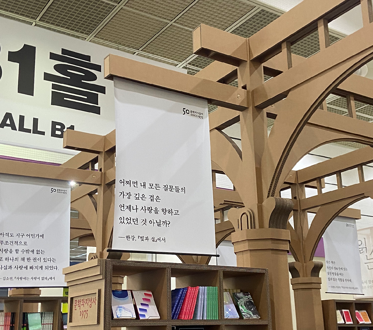 도서전엔 2년 만이다. 작년에 정말 사람이 많았다던데 일하느라 별로 가볼 생각이 없었다. 올해도 많긴 한데 작년만큼은 아닐 것 같다. 제작년에 가장 화려했던 안전가옥이 올해는 없지만, 유명한 출판사들은 여전히 눈에 띈다. 문학과 지성사는 종이 박스를 조립한 형태의 구조물을 부스로 사용하고, 밀리의 서재는 공항 입국 시스템처럼, 문학동네는 문인들의 얼굴을 타일처럼 박아두었다. 알라딘 중고서점은 우주 컨셉의 카페를 운영한다. 알라딘 지점들에서 직원들을 차출했다고 들었다.