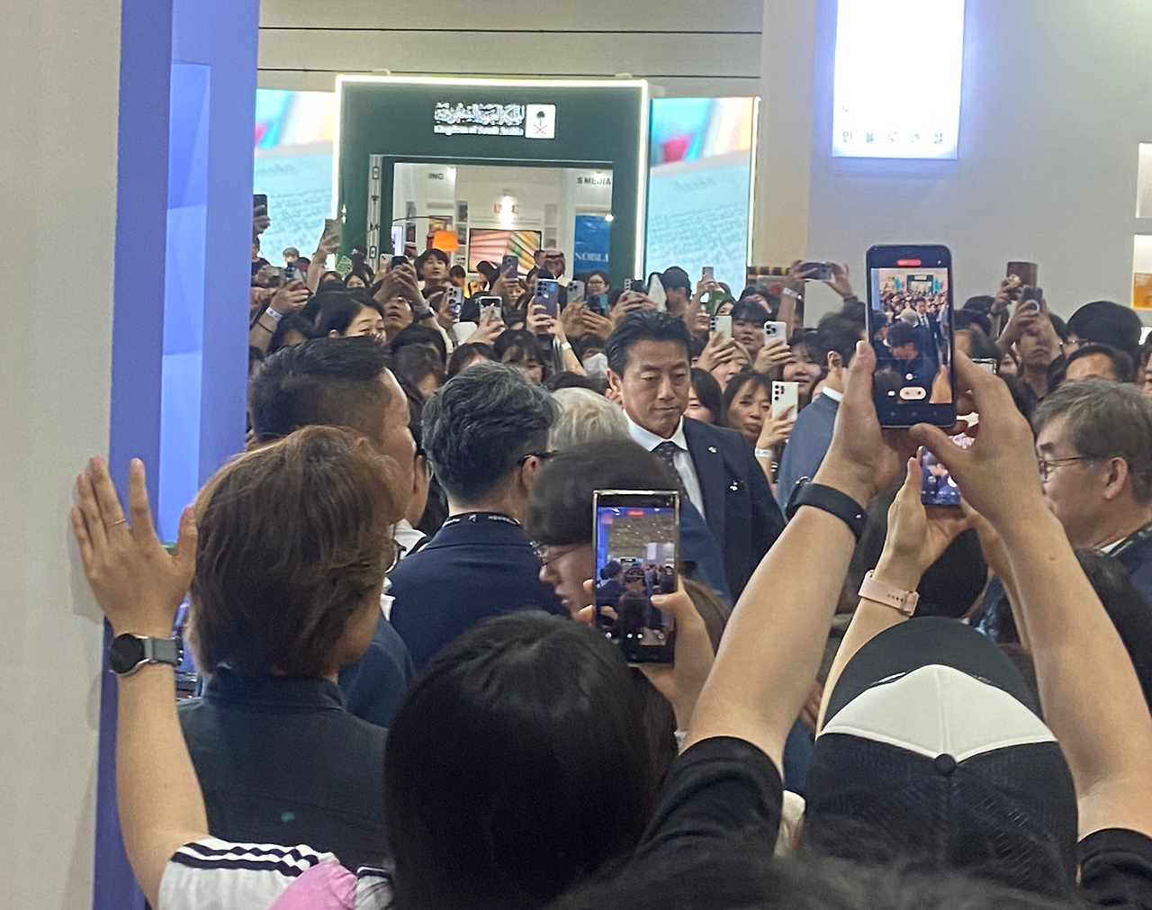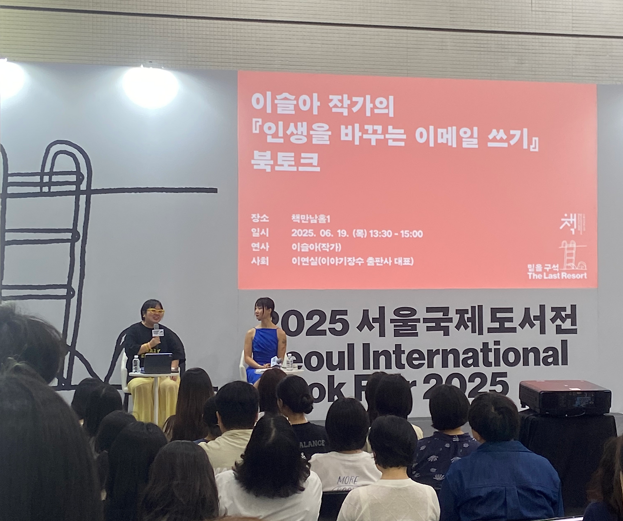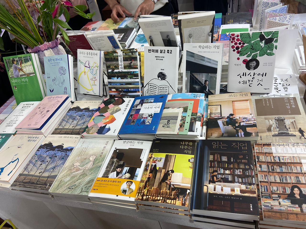 책 라인업만 보고 가장 내 스타일이었던 출판사는 ‘마음산책‘이다. 그러나 슬픈 건 도서전에서 책을 살펴보기가 어렵다는 것이다. 한산한 부스도 물론 있지만, 구경해야지 마음 먹고 간 곳은 거의 들어가지도 못했다. 사람이 너무 많아서 책이 아니라 부스 구경을 하고 온 느낌… 제작년엔 이슬아 작가님을 뵈러 도서전에 왔었는데, 올해는 와서 보니 작가님이 계셨다. 마침 딱 강연 중이셔서 멀리 바라만 보았다. 최근 나온 신간 <인생을 바꾸는 이메일 쓰기>의 메인 컬러인 파란색 홀터넥 드레스를 입고 오셨다. 이연실 편집자님이 노란 안경을 쓰고 노란 바지를 오신 것도 우연은 아닐 것이다.