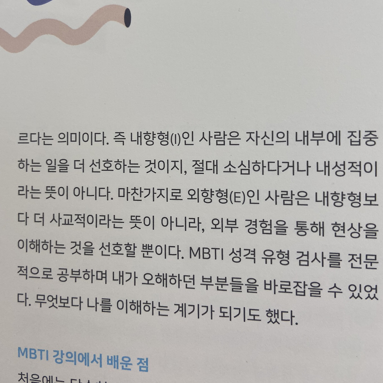 사실 이 책에서 중점적으로 다루는 MBTI 자체만 봤을 땐 이미 한 물 지나간 거 아닌가, 생각할 수 있다. 이제는 대부분의 사람들이 자신의 코드를 알고 다른 사람의 코드에 관심을 가지며, 그 차이를 존중하는 순기능의 덕을 본 지 오래니까. 하지만 책 속의 많은 이들이 MBTI를 과소평가하지도, 과대평가하지도 말라고 말한다.