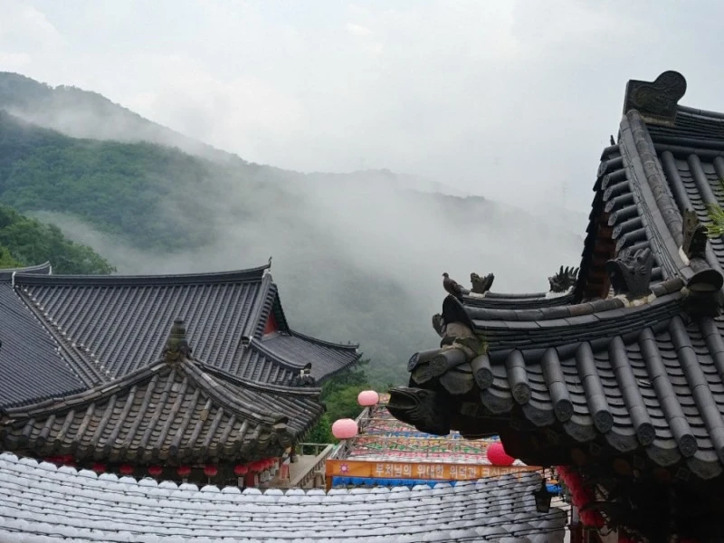 저는 떨어지지 않는 발걸음을 옮겨 산신각에 올랐습니다. 마침 비가 잦아들더니 운무가 아름답게 피어오릅니다.