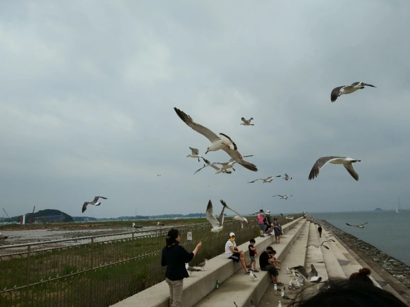 갈매기는 과자를 던져주는 사람 주변을 빙빙 돌고 있습니다. 그 옆을 최대한 피해 지나가던 저는, 배설물이 머리로 떨어질까 봐 불안해졌습니다.