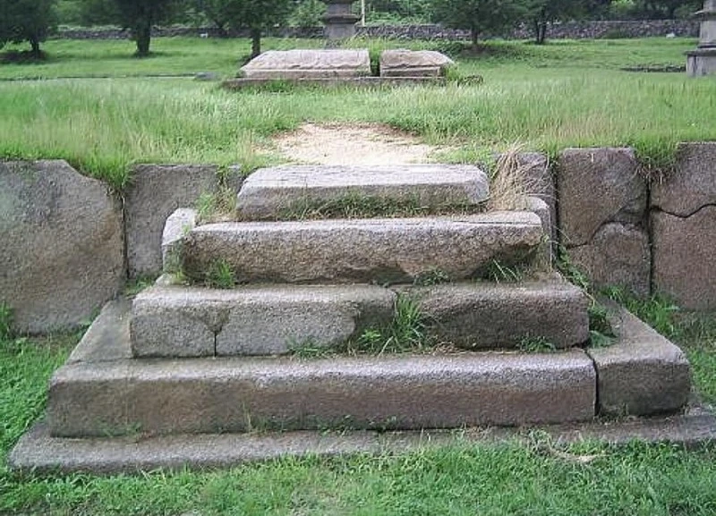 풀을 밟으며, 석계단 앞에 섰습니다. 원래 돌계단 양 옆에, 사자상을 조각한 측면석이 있는데, 그 예술성이 인정되어 문화재로 지정되었으나, 1986년 도난당해 현재 이 계단만 남아있다네요. 이런 황당한 일이 또 있을까요?
