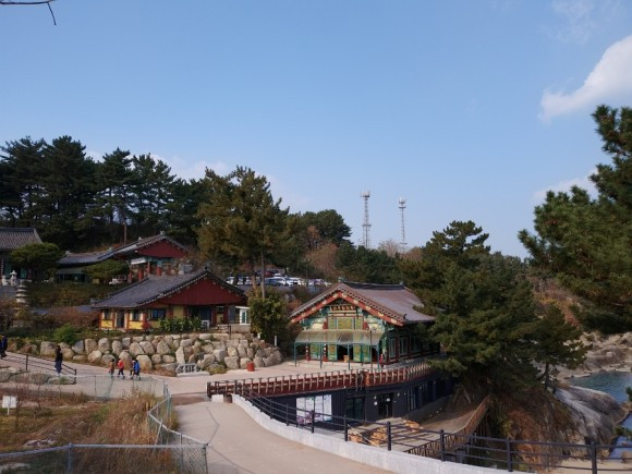 "2003년에 여길 처음 와봤는데, 그때는 이렇게 크지 않았어! 그때 보살님 한 분이 절에 대해 설명을 해주더라. 몸도 쉬고 마음도 쉬고 팔만사천 번뇌를 모두 놓고 쉬고 쉰다는 휴휴암(休休庵)은 조그만 암자였는데 1999년, 이곳 주지스님(홍법스님)의 기도로 관세음보살님의 누워있는 형상이 (물이 빠지면서) 바닷가에 나타나게 되면서부터 사람들의 주목을 받았다고 했어. 물이 빠지기 전에는 그 위에서 수영도 하고 어부들이 고기도 잡았다고 하더라."
