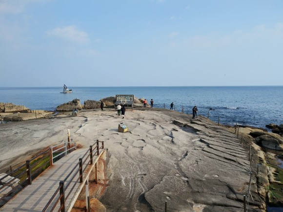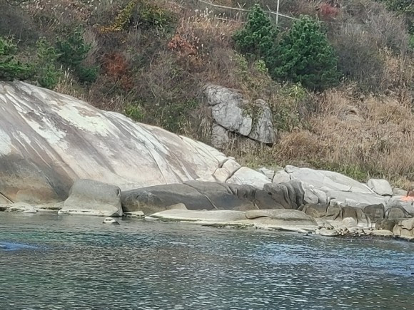 야트막한 언덕을 넘자 보이는 동해바다 푸른빛에 눈이 부셨습니다. 어디가 하늘이고 어디가 바다인지 모를 정도로 온통 파랗습니다. 그리고 눈에 들어오는, 많은 바위 군락과 운동장 같이 넓은 바위, 그 사이로 조그만 해변도 보입니다.
