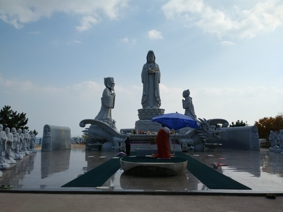 삶의 지혜를 주시는 지혜관세음보살님이 동해바다를 등지고, 인간을 바라보고 계십니다. 저희에게 무지와 어리석음을 깨우치게 해 주시려는 모습으로 그렇게 말이죠. 마침 그 앞에서, 불경을 외는 스님의 낭랑한 목소리가 휴휴암 전체에 울려 퍼집니다.
