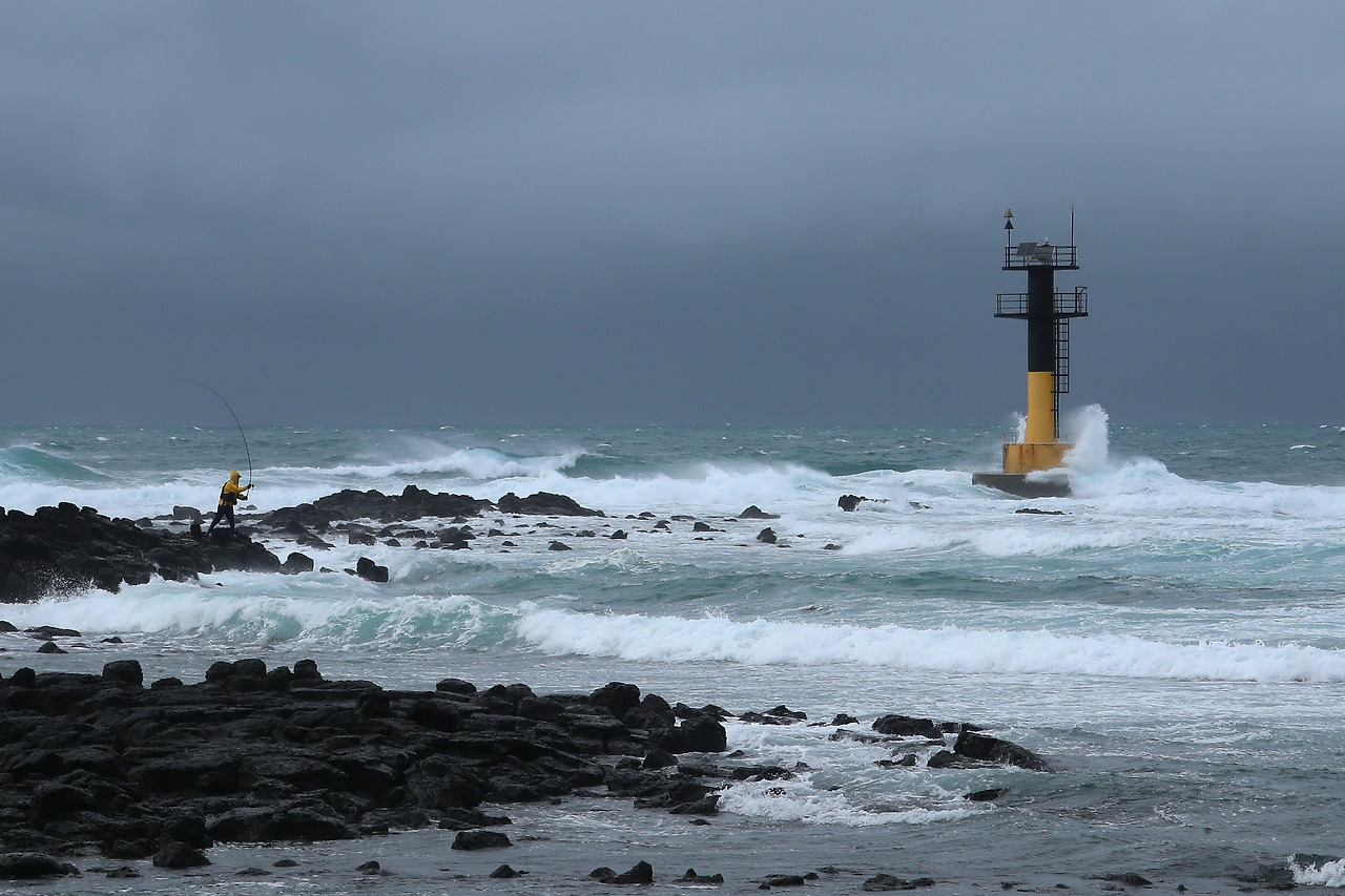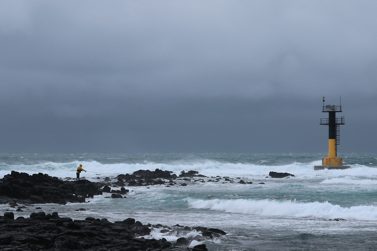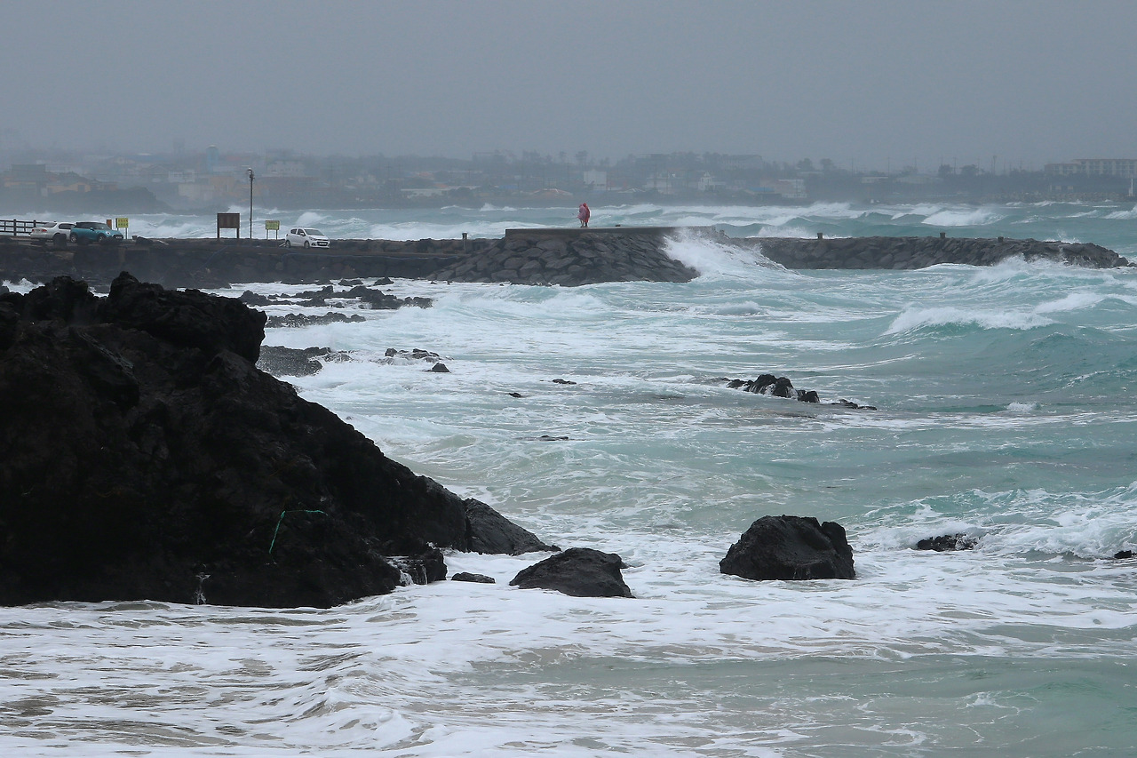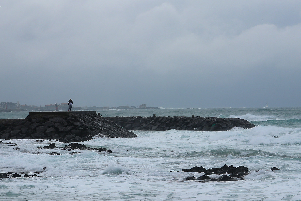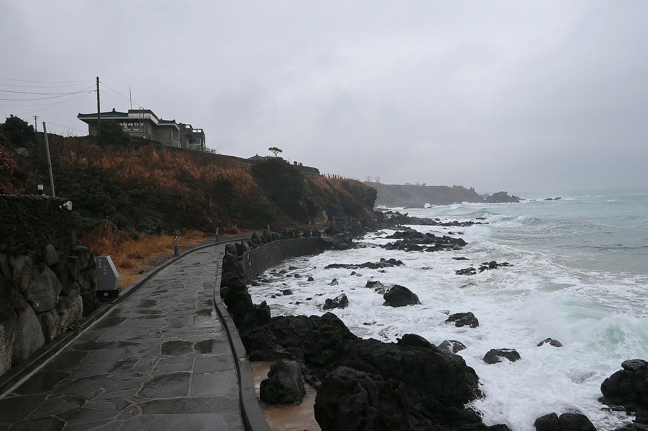 삼다도로 알려진 제주 하면 바람 아닙니까. 비까지 가세해서 파도와 어우러지니 움츠러짐이 즐거운 장관이 연출됩니다. 누구는 미쳤다고, 정신 나갔다고 비웃을 만큼 제법 양이 많은 겨울비와 바람이 함께 거세지고 파도도 난폭해지는 길을 걷습니다. 잔뜩 웅크리고 걷는 나와 달리 가슴을 펴고, 고개를 들고, 서서 바람을 맞는 더 철없는 그들이 반갑기도 하고 부럽기도 합니다. 이 악천후를 대하는 그들의 태도는 분명 나와는 다를 겁니다. 비록 둘 다 자발적으로 이 비속에 서 있다 하더라도 말입니다.
