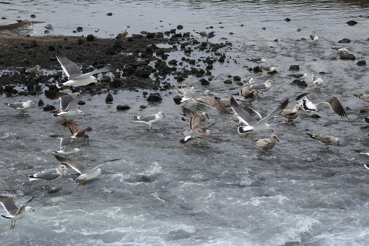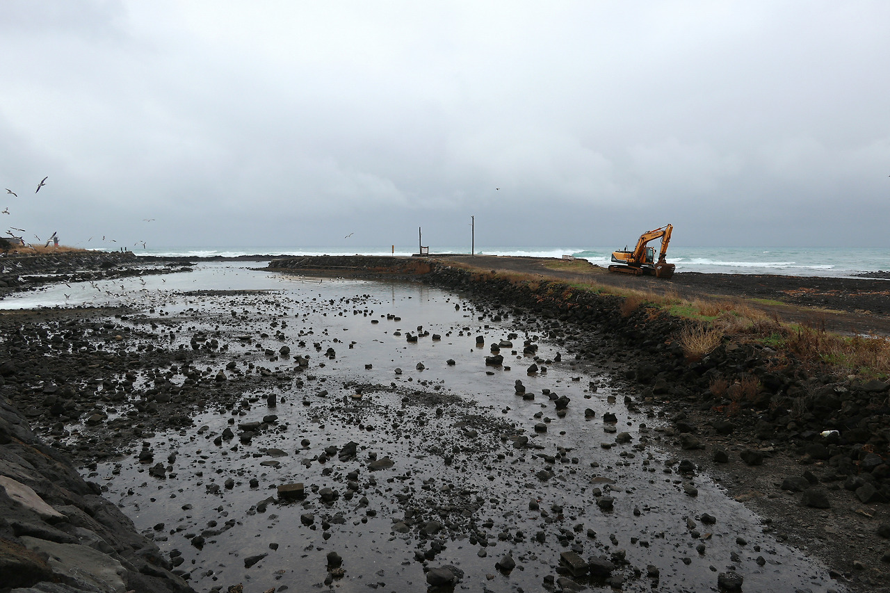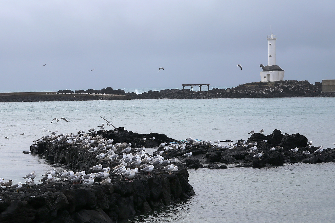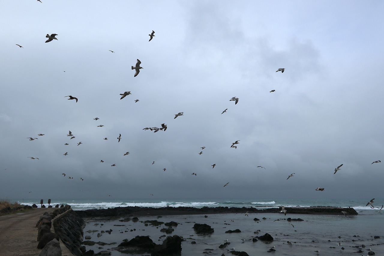 곽지과물 해수욕장을 지나면서 비는 조금 그치고 바람도 잦아든 듯합니다. 혹시나 하고 준비해 간 우의를 입었다 벗었다를 몇 번 하는 동안 날씨가 진정됩니다. 오늘의 목적지를 향해 귀덕 11길을 따라가다가 금성천과 바다가 만나는 지점에 오니 수많은 갈매기들이 먹이 활동을 하고 있습니다. 원래 민물과 바닷물이 만나는 곳에 물고기가 많다고 하는데 혹시 여기서도 곽지처럼 과물이 용천수로 쏟아 나는지도 모릅니다만 지나가는 뜨내기는 알 수 없는 노릇입니다. 거기다가 아마 인근에 양식장이 있나 봅니다. 갈매기들의 먹이가 풍부할 여러 조건들이 갖춰진 갈매기들을 위한 장소이지 사람을 위한 금성 포구라는 이름이 조금 어색하게 느껴집니다. 그래서인지 아니면 날씨 탓인지 배는 보이지 않고 까닭이 가늠이 되지 않는 포클레인이 좌초된 선박처럼 파도치는 바다를 배경으로 웅크리고 있습니다. 이런 날씨에 오늘은 더 이상 지나칠 이 없으리라 방심했던 탓인지 나의 등장에 화들짝 놀란 갈매기들이 하늘로 솟아 올라 괜히 사람을 미안하게 만듭니다. 갈매기들도 나름 영역다툼을 치열하게 한다는 걸 들은 것 같습니다.