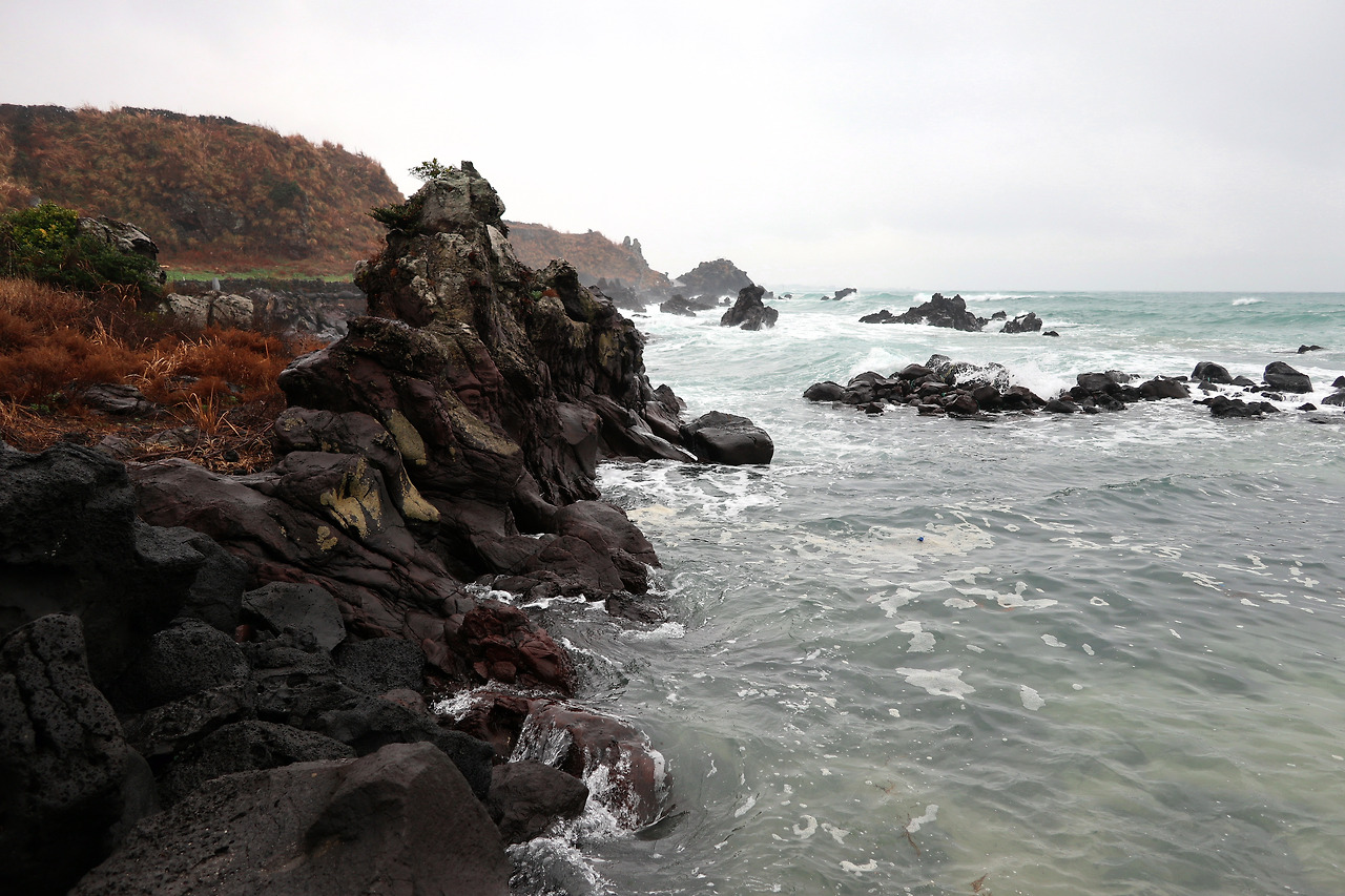 비보다는 바람이 심하게 부는 날 올레길을 걷습니다. 비행기도, 캠핑도 그리고 걷기에도 비보다는 바람이 더 많이 방해가 됩니다. 오늘 날씨가 이러리라는 건 기상예보를 통해 알고 있었지만 바다 건너에서, 싼 항공권과 호텔을 미리 예약해 놓은 입장에서는 일정을 미루거나 취소할 수 있는 권한이 없습니다. 게다가 그렇게 많은 비가 아니라면, 우산 없이 고어텍스 바람막이 점퍼의 모자를 때리는 빗소리가 은근히 듣고 싶어 진다면, 금상첨화라고 속으로 쾌재를 부를지도 모르는 일입니다.