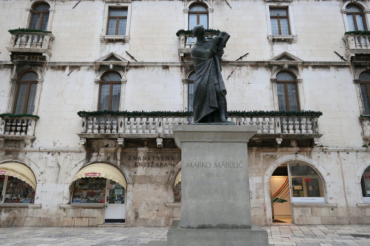 궁전의 서문을 나와서 해안 쪽으로 가다 보면 브라체 라디츠 광장이 나옵니다. 15세기까지 베네치아 주둔군의 요새로 사용되던 곳인데 지금은 기념품을 파는 작은 숍과 바가 모여 있습니다. 동상의 주인공은 크로아티아 국민시인 마르코 마룰리치입니다. 마룰리치는 성서에서 위기에 처한 이스라엘을 구한 영웅 유디트를 소재로 삼은 <유디타Judita>라는 작품으로 크로아티아인들에게 희망의 메시지를 전해 국민작가로 이름을 날렸습니다.