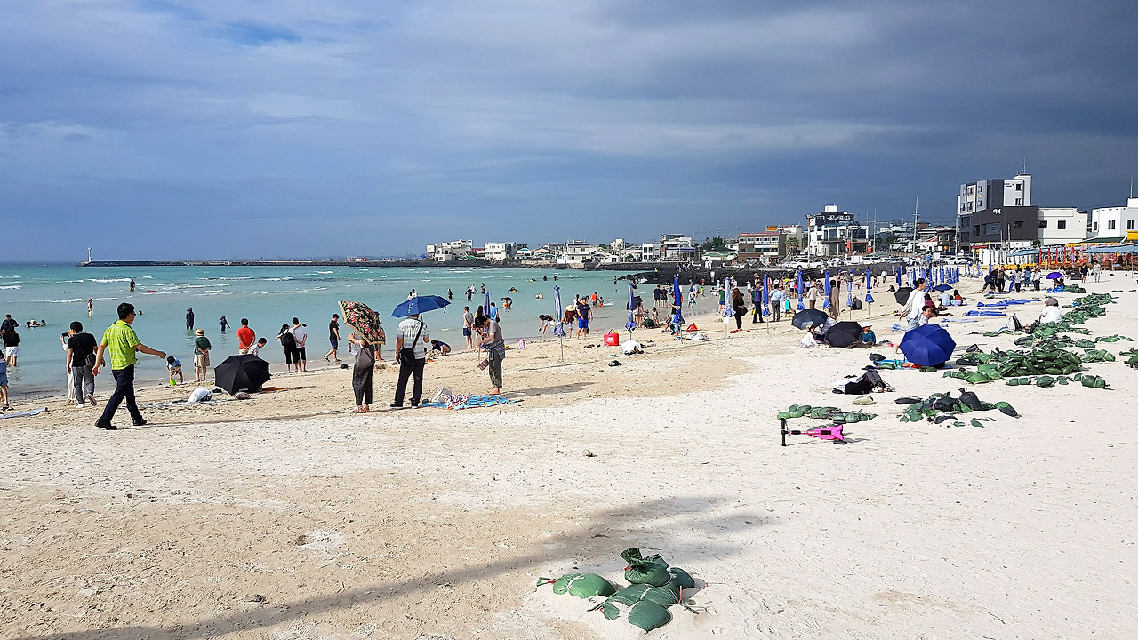 어럽쇼! 태풍이 온다더니 바람은 시간이 갈수록 잦아들고, 비는 아침 한때 잠시 내리더니 아예 종적을 감추어, 여태 지나온 길 위에서 마주친 사람들이 별로 없었다는 것으로 그나마 태풍의 존재를 인정만 하고 있었는데, 이제는 구름을 뚫고 해까지 얼굴을 내밀고 있습니다. 그러더니 어디선가에서, 그 어디서 여태껏 숨죽이고 있었는지 모를 그들, 남녀노소 구별 없는 사람들이, 마치 썰물 때나 아니면 파도가 훔치고 지나간 갯바위 틈새에서 떼 지어 몰려나오는 갯강구들처럼 어느 순간에 그 하얀 모래 위를 뒤덮고 있습니다. 나는 태풍인데도 태풍 같지 않은 날씨가 신기한 것보다, 바뀐 날씨로 인해 그렇게 짧은 시간에 그토록 많은 사람들이 혼연일체가 되어 카드섹션 하듯 희디 흰 모래사장을 울긋불긋하게 물들이는 그 거짓말 같은 광경에 벌어진 입이 다물어지지가 않습니다.