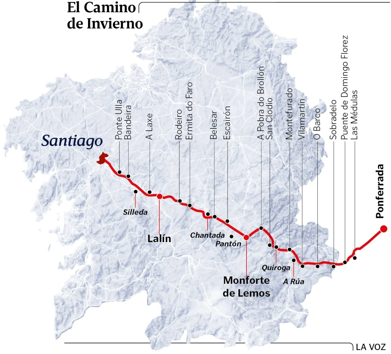 갈리시아 산맥을 가로지르는 실 Sil 강을 따라 연결되는 총 263km 루트로, 프랑스길보다 조금 아래로 흐릅니다. 폰페라다에서 산티아고까지가는 옵션이 2개인 셈인데, #겨울길 이 56km 더 깁니다.