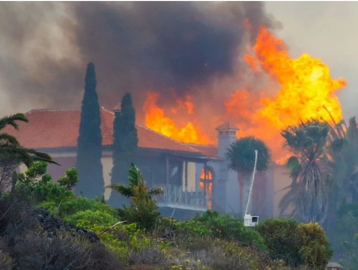 용암이 흘러내려 라 팔마에 있는 집들을 파괴하고 있다는 타이틀.