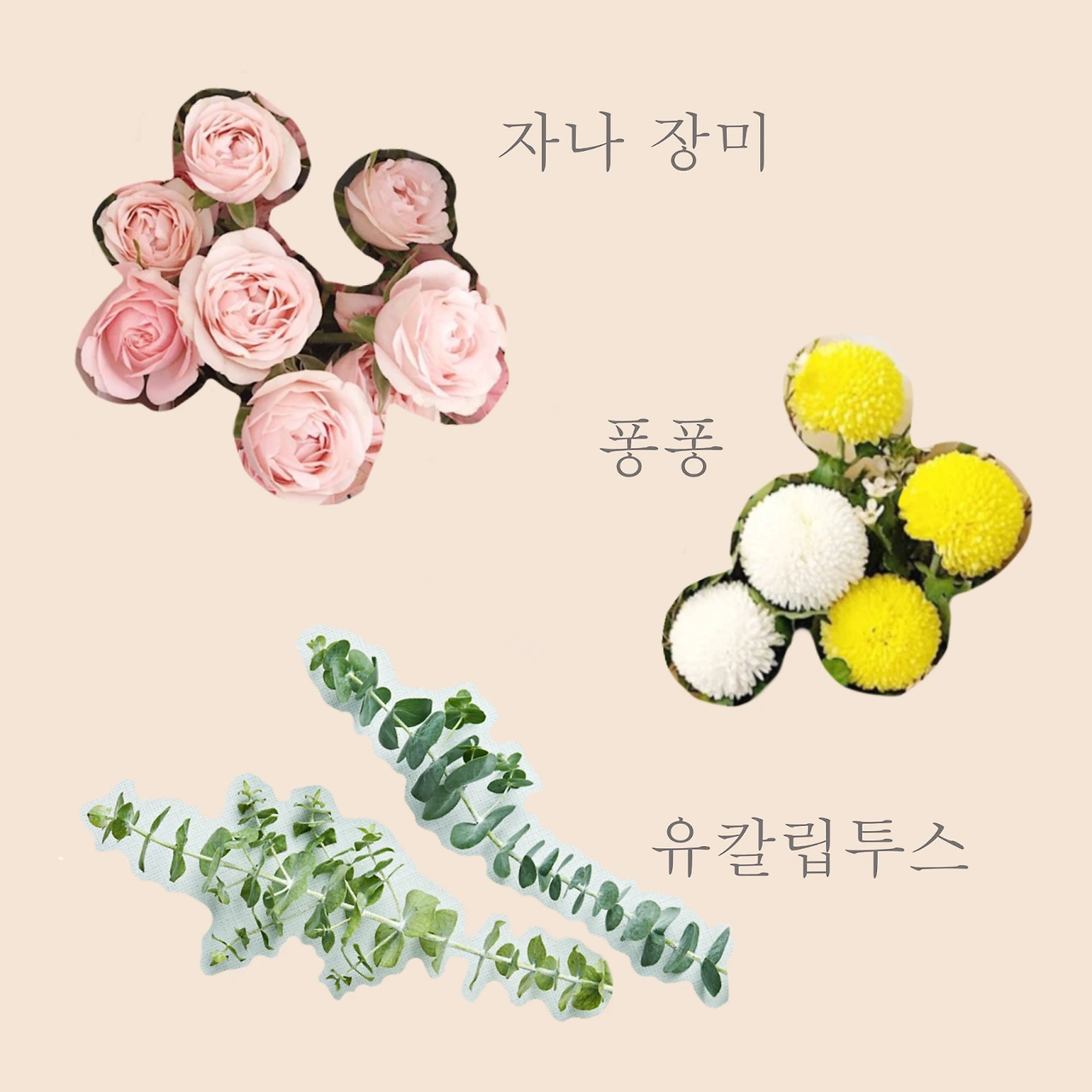 소재 중 귀여운 느낌을 주는 건 유칼립투스다. 유칼립투스는 가장 흔하게 쓰이는 소재라 눈에 익을 텐데, 동그란 잎을 가졌고 향이 좋아 유칼립투스만 따로 화병에 꽂아두는 경우도 있다.