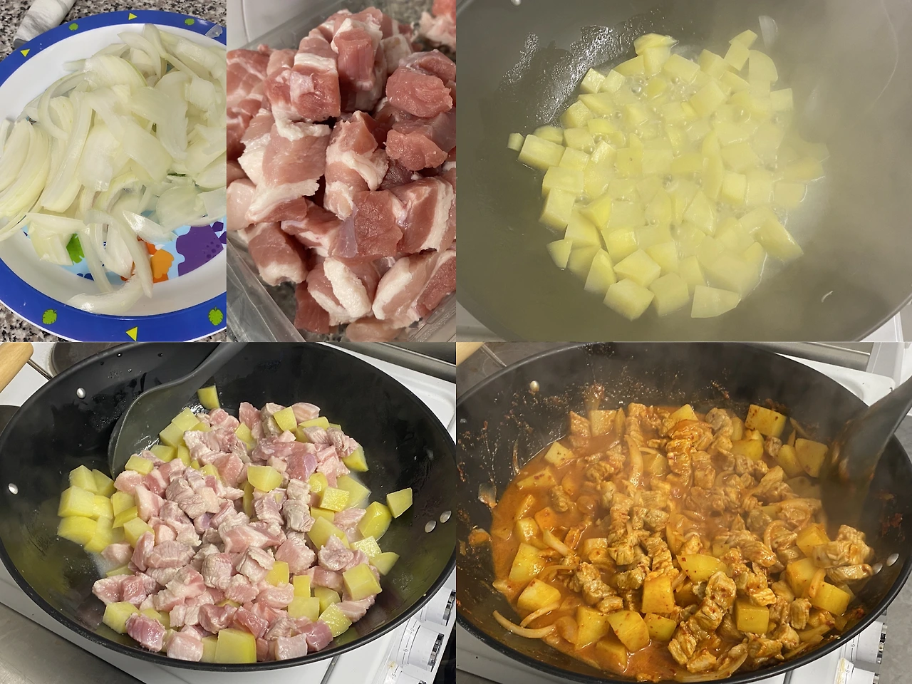 3. 감자가 반 이상 익으면 돼지고기와 다른 채소를 넣는다.
