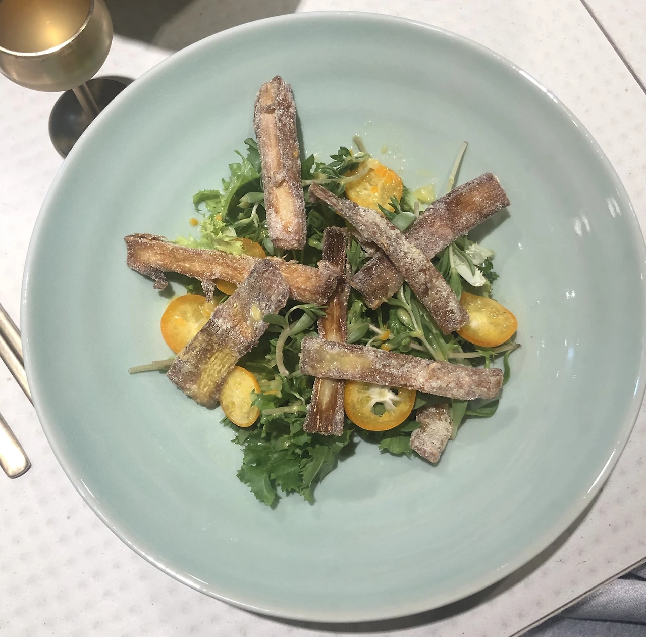이날의 맡김차림은 봄 쑥국으로 시작해 죽순 금귤 샐러드, 두릅 더덕전, 버크셔K 안심 육전, 지리산 산딸기, 버크셔K 삼겹 고추장찌개, 홍삼 캬라멜과 인절미 마카롱으로 이어졌다. 유자라는 특수한 재료가 들어가다 보니 음식마다 조화로운 정도가 달랐다. 술과 음식의 궁합을 썩 예리하게 판별하는 편은 아니지만, 내 입맛에는 상큼한 죽순 금귤 샐러드와 가장 잘 어우러졌다. 샐러드에 당귀, 돌나물 같은 쓴 맛이 있는 채소가 있어 단 술과 함께하기 좋았던 것 같다. 반대로 유자 자체에 당분이 있다보니 단맛이 강한 고추장찌개와는 부딪치는 느낌이었다. 고흥유자주를 드시게 된다면 쌉쌀한 채소가 들어 있는 샐러드와 함께하시는 것을 추천한다.