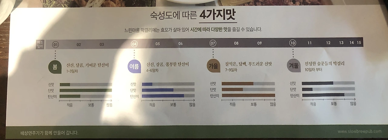 마지막 방문지는 느린마을 양조장이다. 막걸리의 끝판왕을 제대로 먹어보기 위해 대표 브랜드를 찾았다. 이곳에서는 병에 담긴 느린마을 막걸리가 아닌 갓 만든 생막걸리를 먹어볼 수 있다. 아래 표처럼 느린마을 막걸리는 봄, 여름, 가을, 겨울 네 종류가 있는데, 겨울로 갈수록 발효기간이 길고 단맛 대비 신맛의 비율이 커진다. 겨울이 술꾼들의 막걸리라고는 하지만 나는 정반대로 탄산이 가장 약한 봄 막걸리를 골랐다. 봄 막걸리는 신맛이 거의 없다시피 했고 탄산감도 미미했다. 지금까지 먹어본 막걸리 중 아침햇살과 가장 가까웠고 내 입맛에도 가장 잘 맞았다. 평생 술꾼은 못 될 것 같다.