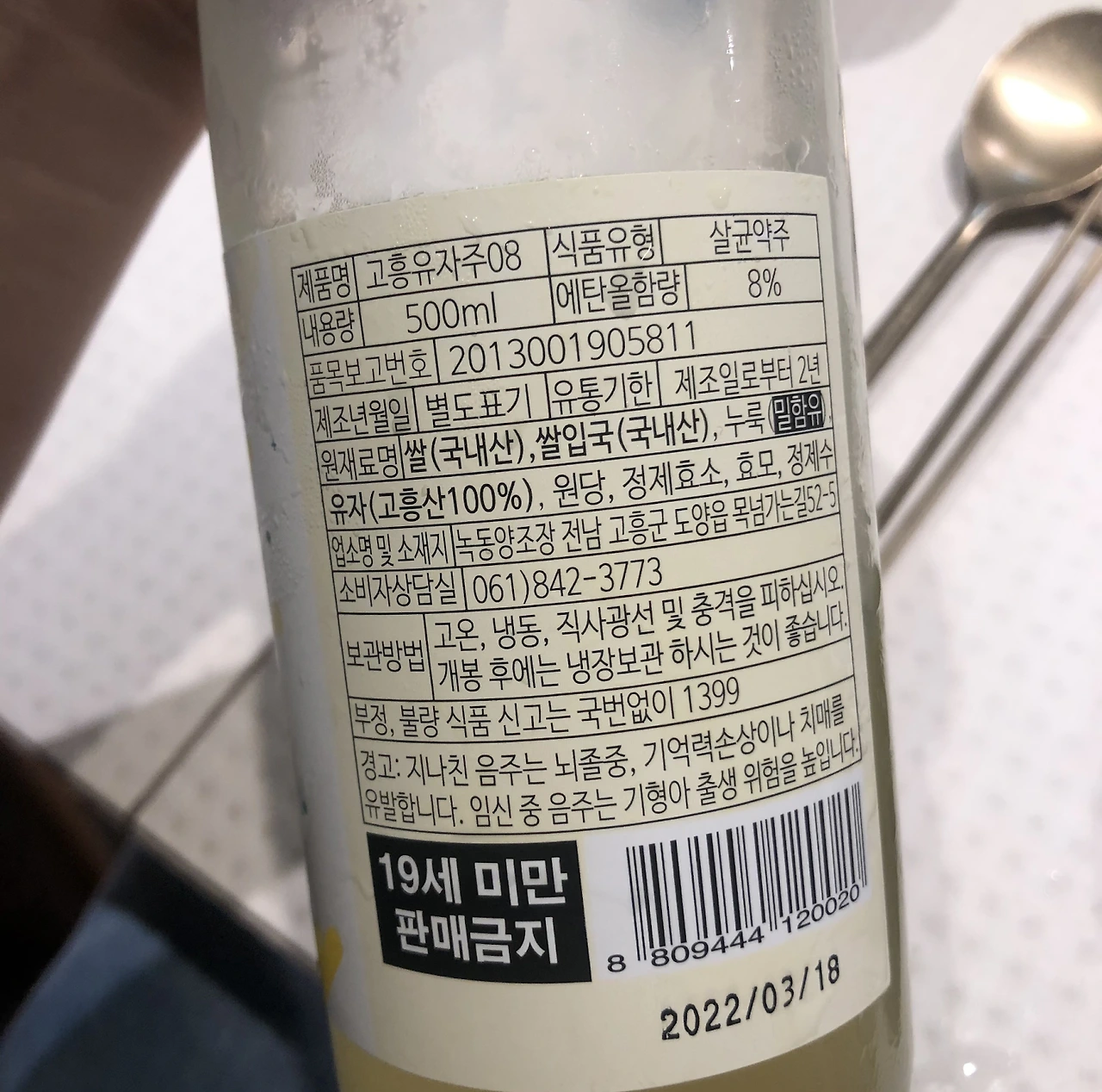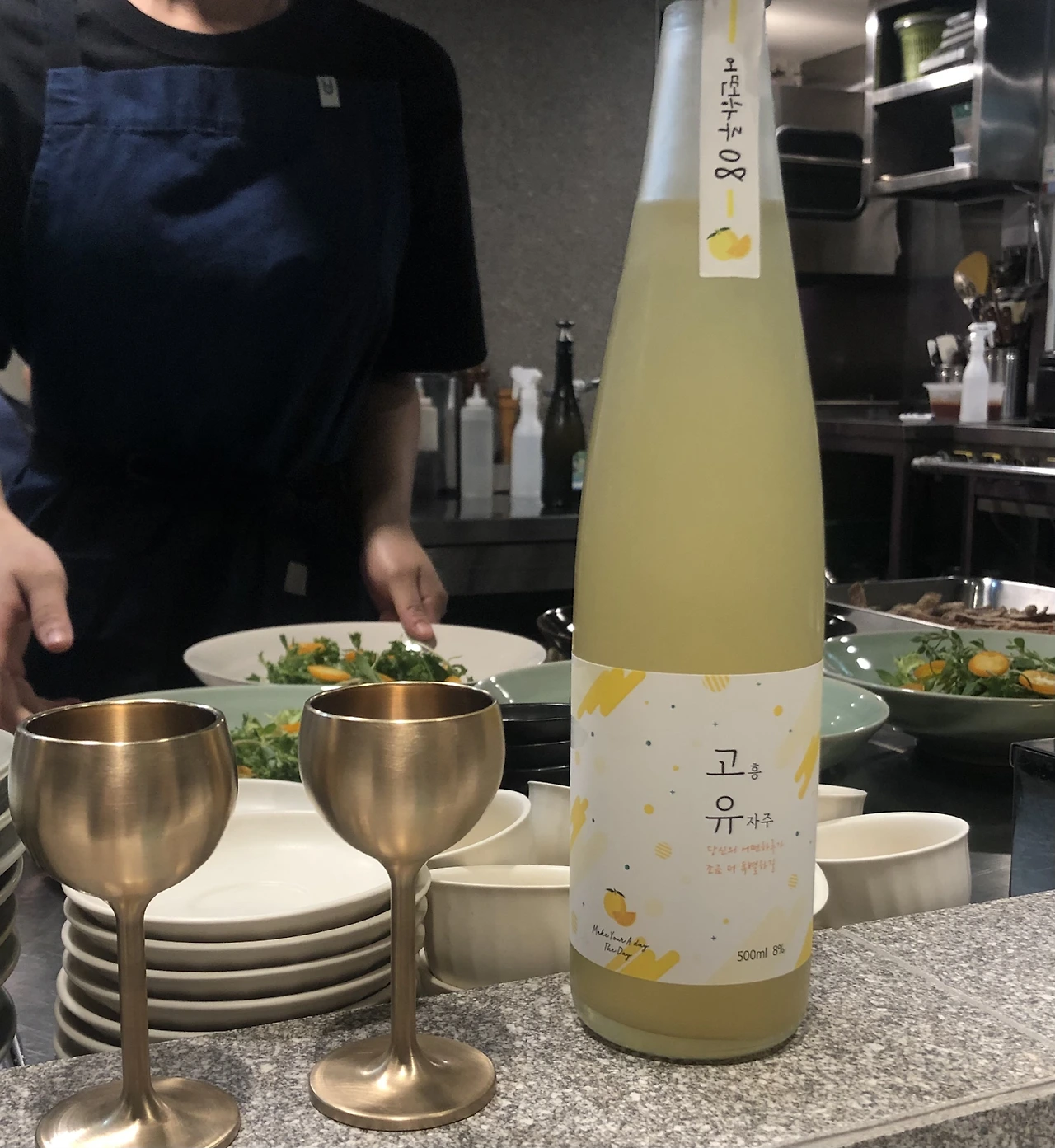 귀여운 잔과 함께 서빙된 고흥유자주는 깔끔한 유자차의 느낌이었다. 유자차를 마실 때 과일청의 강한 단맛을 싫어했다면 먹어볼 만 하다. 유자가 술을 만나니 뒷맛이 술의 쌉쌀한 맛으로 상쇄되어 부담이 없었고, 탄산기 없이 맑은 편이어서 호로록 마시기도 좋았다. 라벨을 살펴보니 고흥유자주는 약주에 속한다고 표기되어 있었다. 약주는 쌀이나 감자, 고구마 등으로 만든 누룩 1% 이상을 사용한 술이다. 발효주는 걸쭉한 술일 거라는 편견 때문에 당연히 고흥유자주도 증류주에 속할 줄 알았는데, 발효기법이 사용된 맑은 술이었던 것이다.