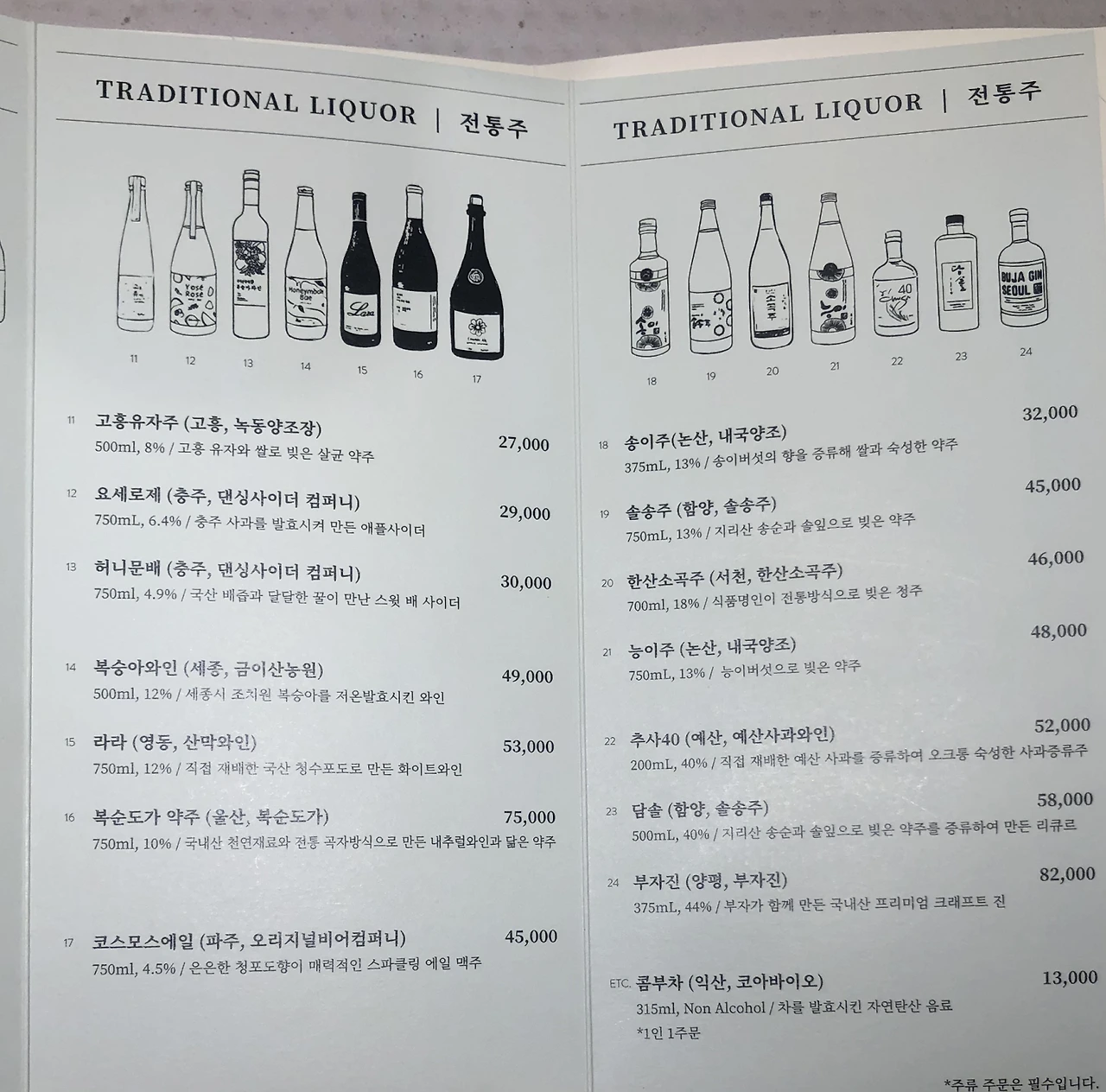 전통주 좀 먹어 본 지인의 추천을 받아 서울 합정에 위치한 ‘지리’를 방문했다. ‘지리’는 지리산 식재료로 만든 맡김차림(오마카세)과 전통주를 함께 즐길 수 있는 곳이다. 다양한 안주와 술을 함께 먹어보며 조합을 판단해보기 좋은 곳이라고 생각해 방문을 결정했다. 주류는 막걸리와 기타 전통주로 구분되어 있었고, 술을 잘 모르더라도 아래에 적힌 간단한 설명을 보며 취향껏 고를 수 있었다. 에디터 먼지는 요즘 핫하다는 한산소곡주를 추천했으나 도수도 가격도 높은 관계로 또 다른 유명한 술인 고흥유자주를 골랐다.