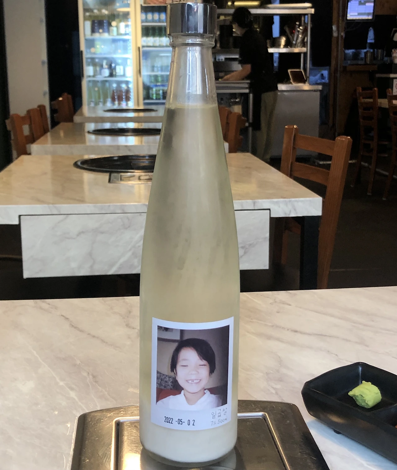 일곱쌀 막걸리를 맛보기 위해 판매처 중 하나인 ‘갈현차돌’에 방문했다. 일곱쌀 막걸리는 ‘쉽고 재미있는 술’을 지향하는 한아양조의 제품으로 라벨에 개구진 아이의 모습이 담겨 있다. 이 아이가 사실 한아양조 대표의 어릴 적 모습인데, 일곱쌀(7도)-아홉쌀(9도)-열두쌀(12도)로 갈수록 아이가 술에 취한 것 마냥 점점 뒤로 넘어간다. 나이가 올라갈수록 탄산감이 강해지고 더 응축된 맛이 느껴진다고 한다. 우리의 목적은 단 하나, 탄산이 약한 막걸리였기 때문에 고민 없이 일곱쌀 막걸리를 주문했다. 술을 먼저 맛보니 약한 탄산감과 부드러운 쌀맛이 느껴졌다. 시큼한 맛이 없지는 않지만 약한 편이어서 크게 거슬리지 않았다. 이번에 곁들일 음식은 차돌박이다.