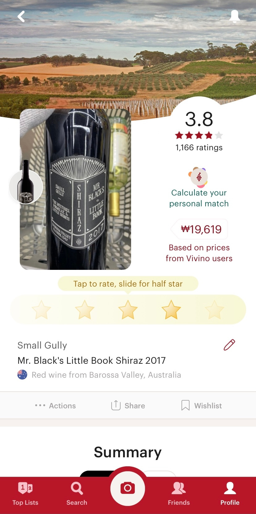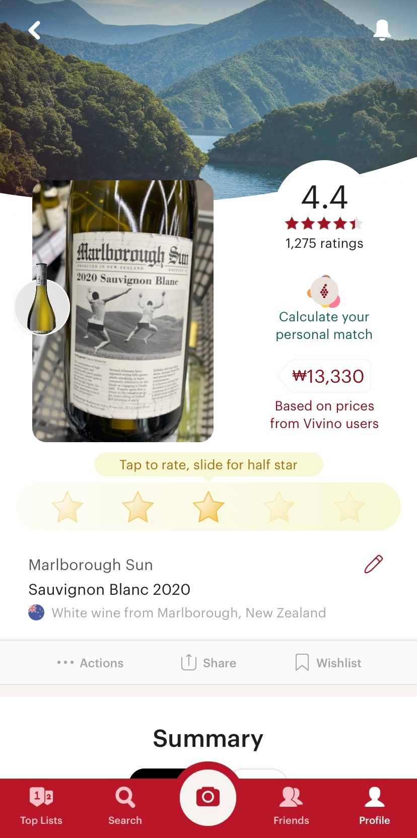 와인 라벨을 스캔하면, 산지와 평점, 맛에 대한 묘사, 그리고 리뷰들이 보인다. 가격은 부정확해서 참고하지 않는 것이 좋을 것 같다. 한국어는 지원하지 않아 영어로 사용해야 한다는 것이 단점이지만, 평점과 맛의 특징 정도를 확인하는 것으로 충분하기에 큰 무리는 없다.