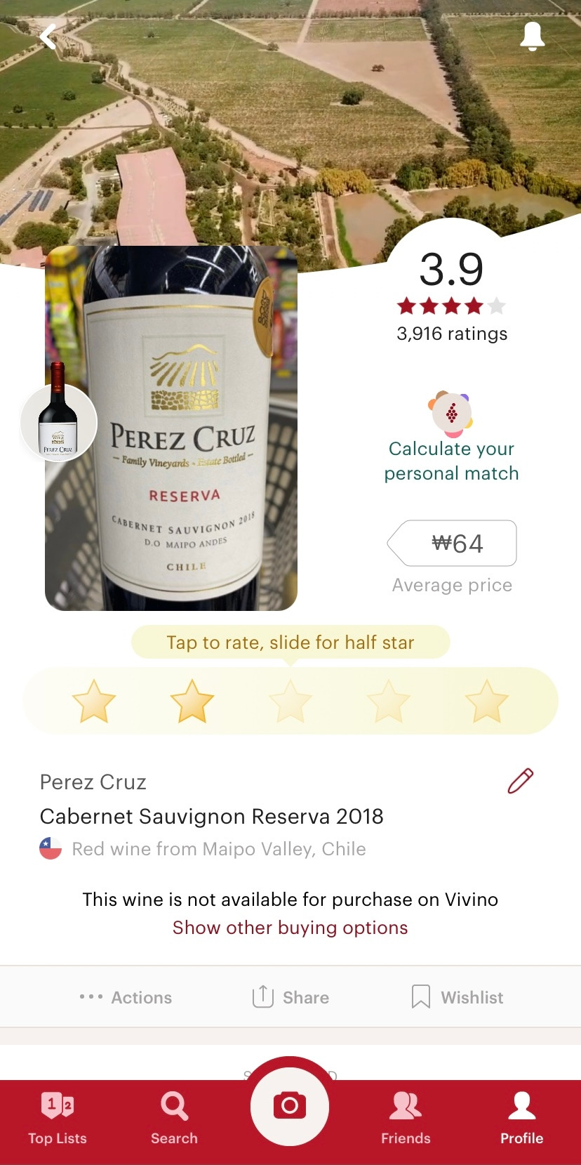 새마을 구판장에서 와인을 구경하는 사람 중 와인병 사진을 찍는 경우가 꽤 있었는데, 알고 보니 그것은 ‘비비노(Vivino)’라는 와인 평점 앱에 와인 라벨을 스캔하기 위해 찍는 것이었다. 와알못에게 와인 평점이란 한 줄기 빛과도 같았기 때문에, 바로 비비노 앱을 다운받아 와인을 스캔해보기로 했다. 하지만 새마을 구판장의 수많은 와인을 일일이 다 찍어볼 수는 없는 법. 첫 번째와 두 번째 기준을 충족한 와인만 스캔해보았다.