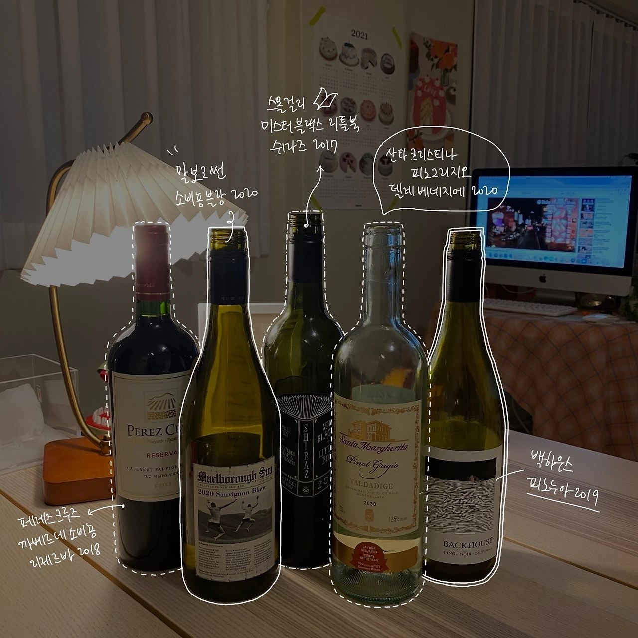 그래서 고르게 된 와인은 총 5개! 왼쪽부터 페레즈 크루즈 까베르네 소비뇽 리제르바 2018, 말보로 썬 소비뇽 블랑 2020, 스몰 걸리 미스터 블랙스 리틀 북 쉬라즈 2017, 산타 그리스티나 피노 그리(지오) 델레 베네지에 2020, 백하우스 피노 누아 2019다.
