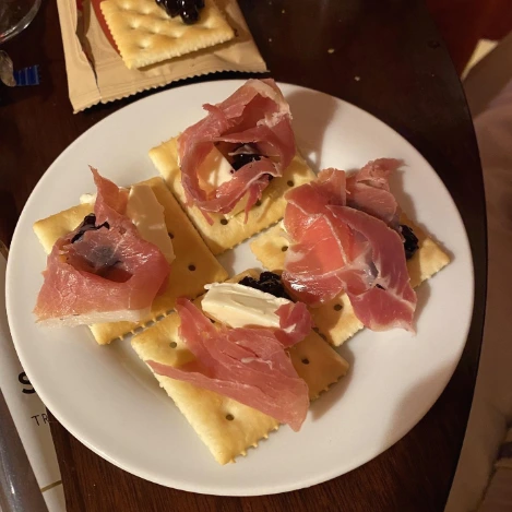 먼 ver. 아이비나 참 크래커에 알갱이가 살아있는 샹달프 블루베리 잼, 르갈 크림치즈, 프로슈토까지 얹어서 먹으면 완벽한 단짠 까나페가 된다! 같이 먹을 와인으로는 '19 크라임즈 쉬라즈'나 '프로메사 쉬라즈'를 추천한다.
