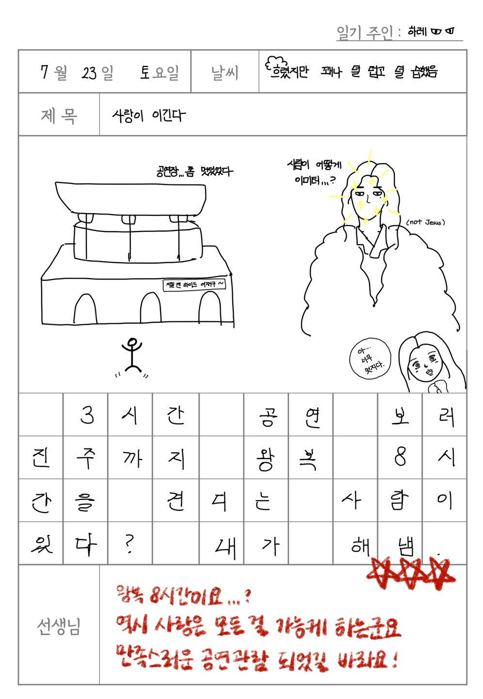 한 번도 가본 적 없고, 연고도 없는 지역에 가게 되었다. 그렇다... 뮤지컬 지방 공연을 보기 위해서다... 그림일기는 진주에 다녀온 내용이지만, 사실 저 후에 여수도 다녀왔다. 끝내주는 공연을 보았기에 후회는 하지 않지만 체력이 아직도 돌아오지 않고 있다. 아무튼 사랑이 이긴다...