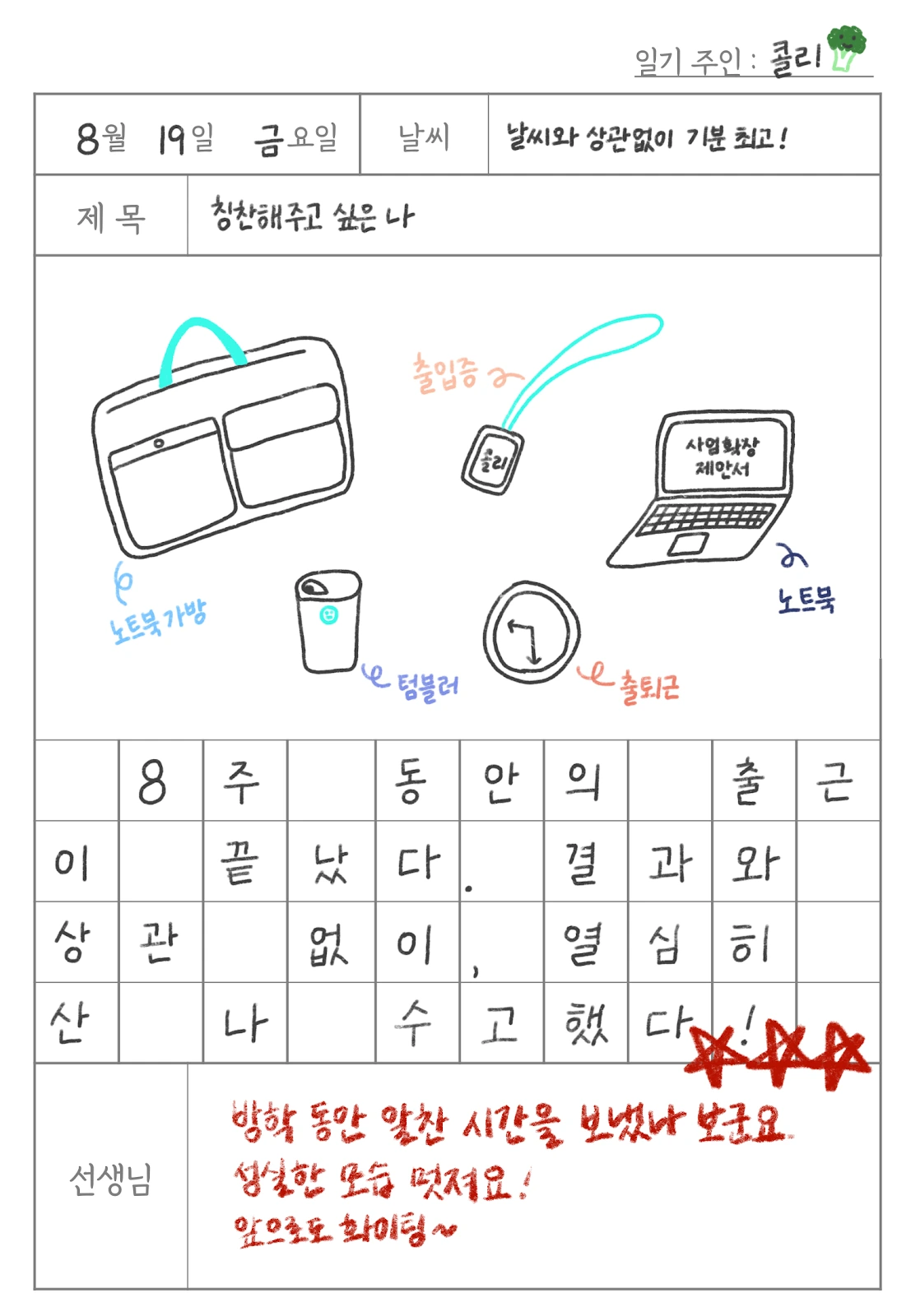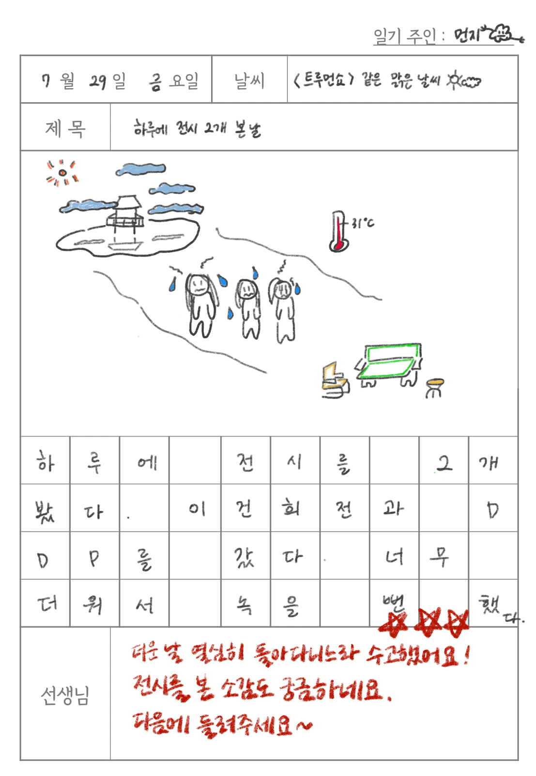 계획을 세우는 것보다 중요한 건 실천하는 거랬다. 에디터들은 두 달 전 야심차게 여름방학 계획을 세웠다. 얼마나 성실하게 지켰나 돌아보고, 이번 방학 동안 각자에게 일어난 즐거운 일들을 공유해 보자! 동심을 소환하기 위해서 그림일기 형식을 활용했다.