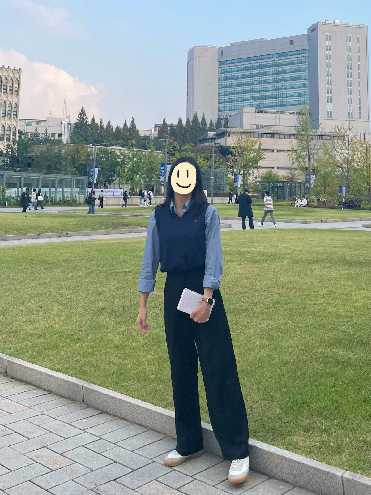 : 남색 니트 조끼+파란 스트라이프 셔츠+와이드 팬츠+슬림한 스니커즈