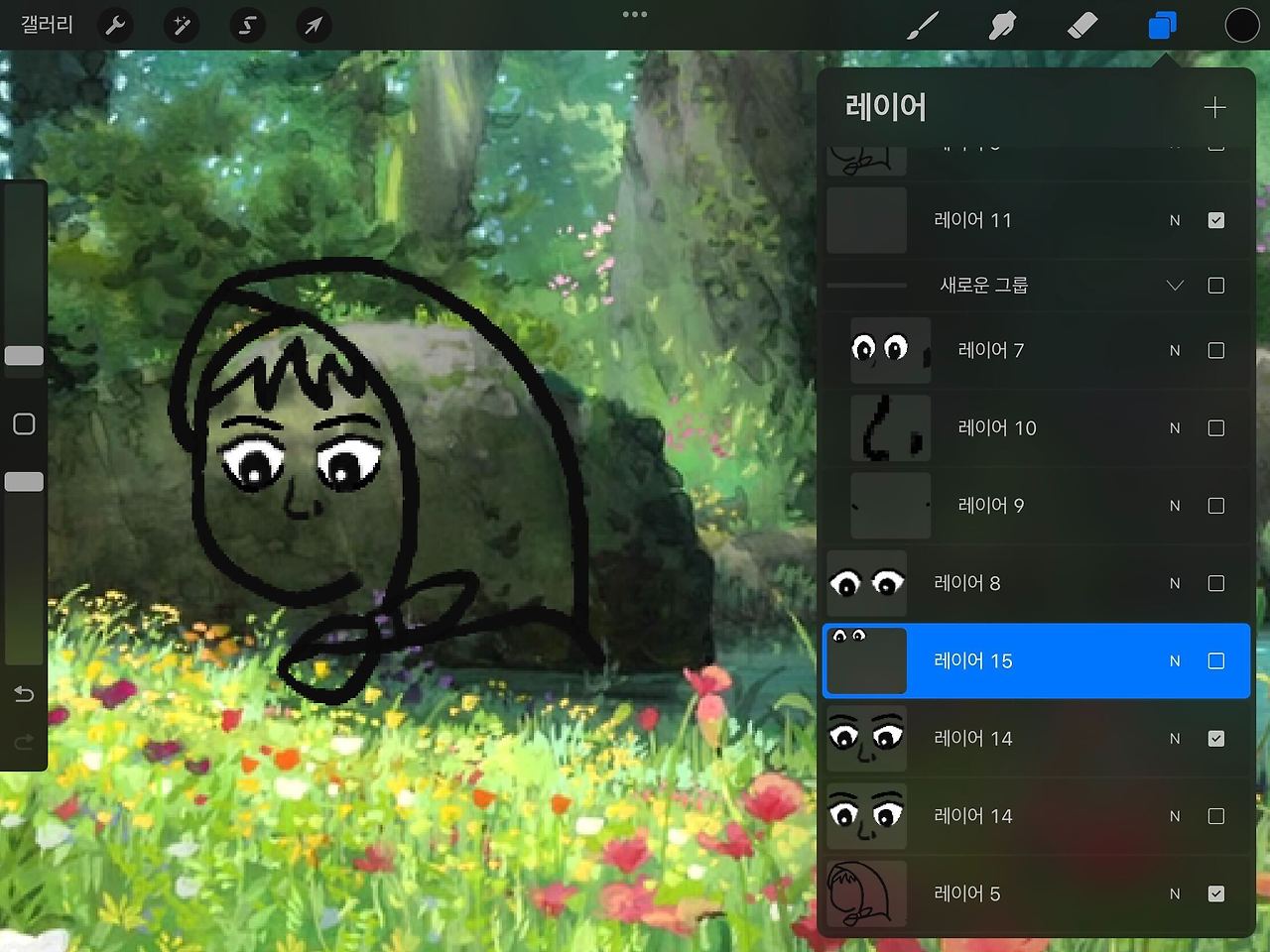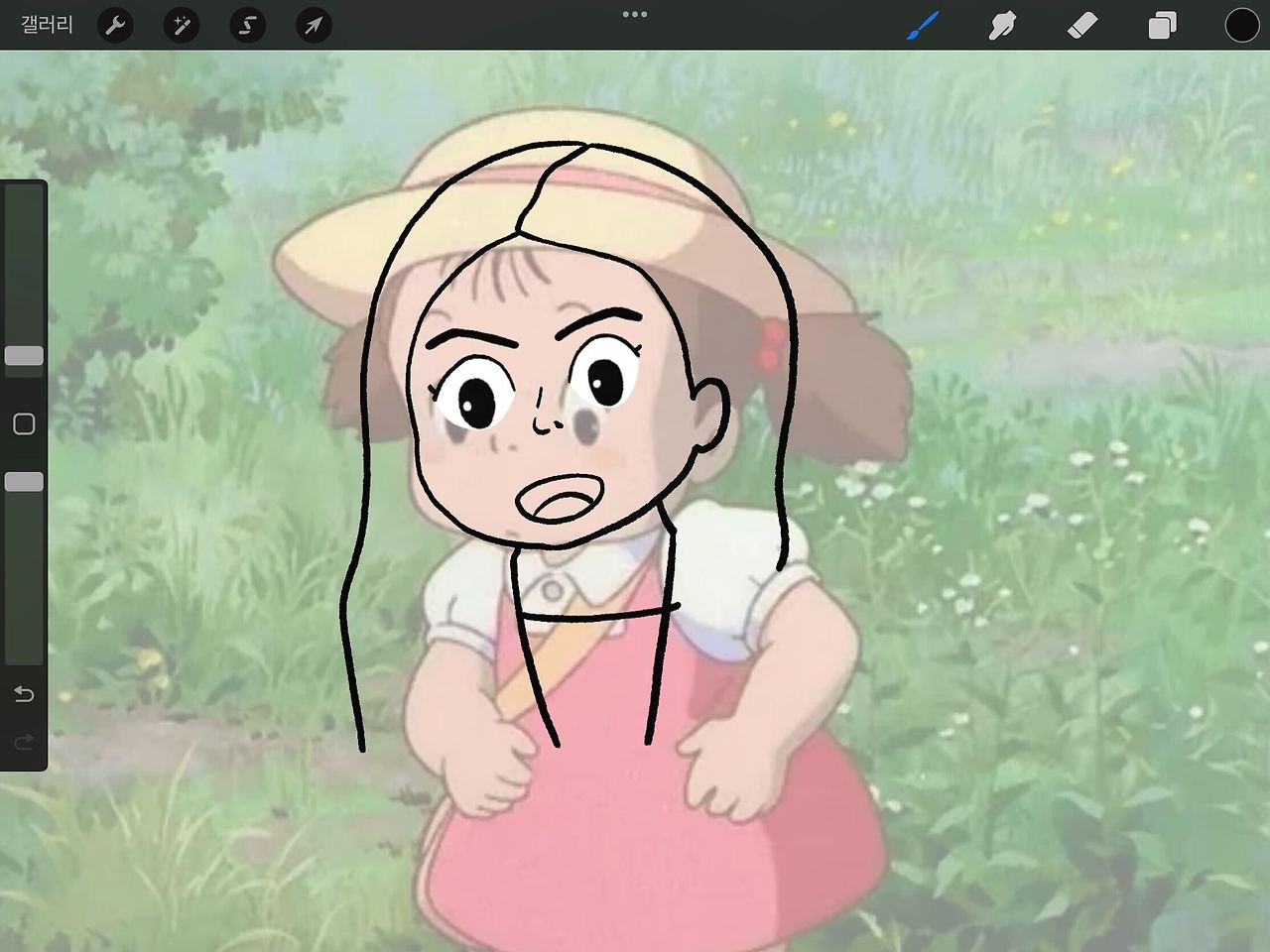 주인공들을 실컷 귀여워하며 구경했으니 이제 따라 그려볼 차례다. 한때 인물 사진을 디즈니 캐릭터처럼 바꿔주는 카메라 필터가 유행했었는데, 지브리 필터가 있었다면 어떤 느낌이었을지를 상상해서 그려보기로 했다. 지브리 그림체에 잘 어울릴 만한 인물을 에디터들에게 추천 받다가, 예능 프로그램에서의 모습이 무척 깜찍한 이영지를 지브리 캐릭터로 재탄생시키고자 시도했다.