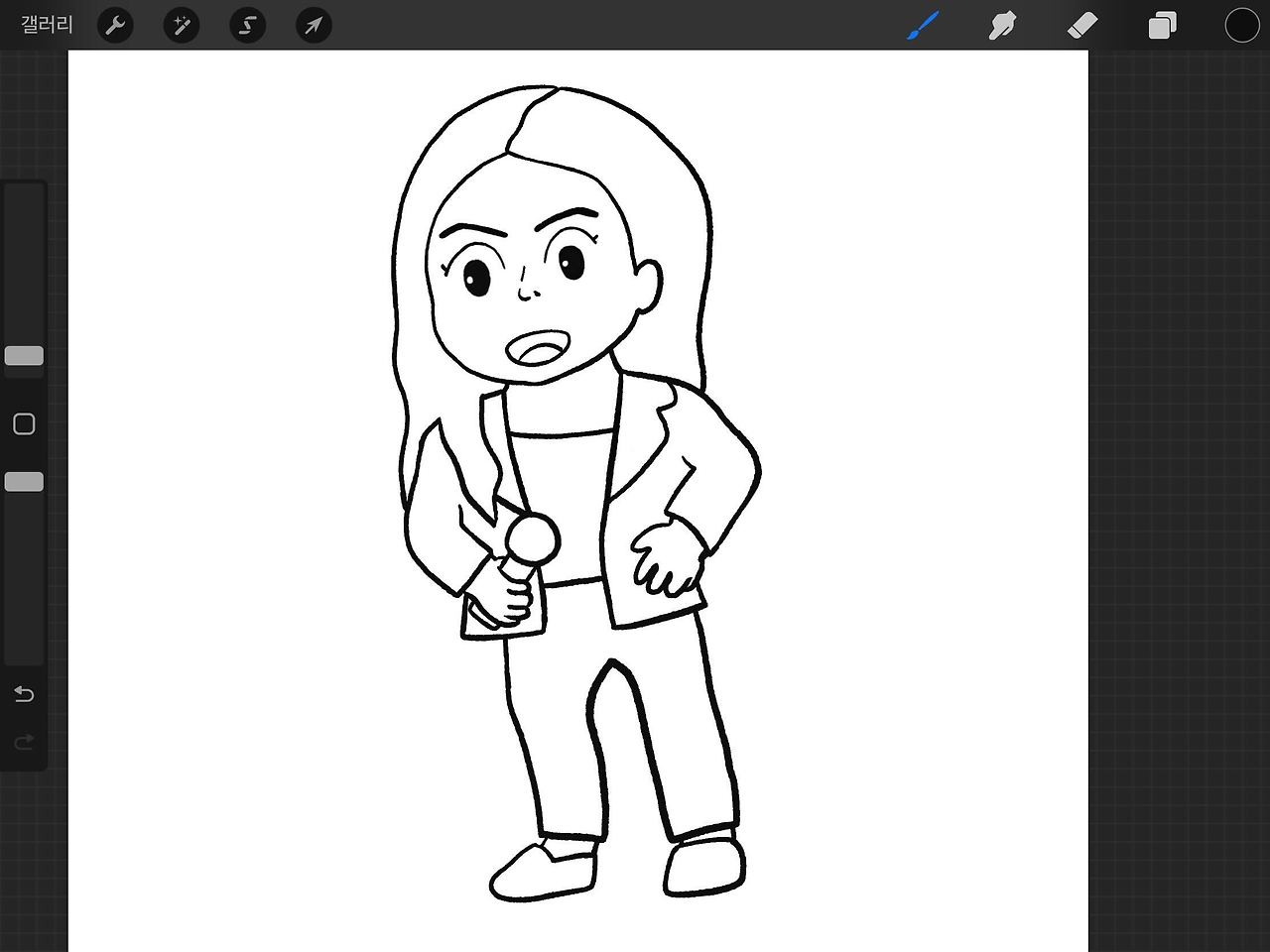 반듯한 눈썹, 존재감 있는 코를 그렸지만 생각보다 캐릭터에서 이영지가 느껴지지 않았다. 그래서 치트키로, 스타일링을 추가했다. 쇼미더머니에서 우승한 이영지의 사진을 보고, 수트에 마이크를 들고 있는 모습으로 그리고 나니 이제야 조금은 이영지 같아졌다. 3등신으로 그려야 하다 보니 하의의 디테일은 살리지 않고 그냥 앙증맞은 비율로 완성했다.