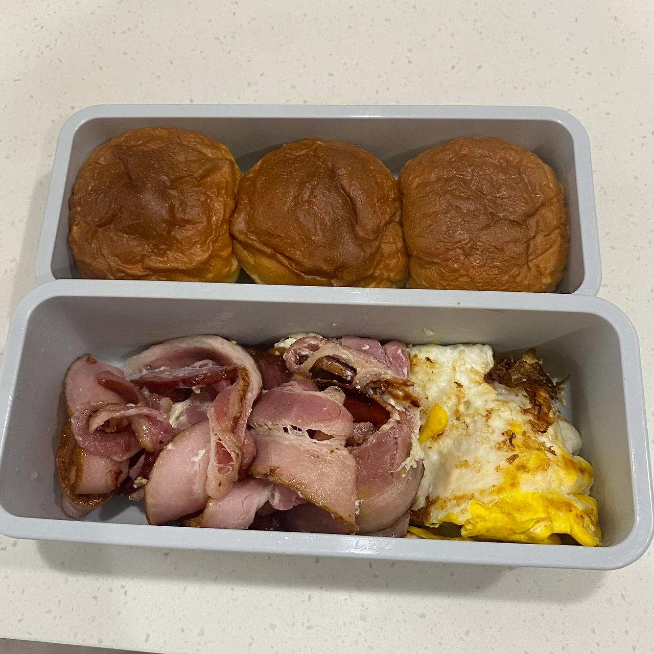 베이컨과 계란을 부쳐서 도시락통 밀폐통에 고이 접어 넣고, 모닝빵 세 알을 다른 한 통에 구겨 넣었다. 아주 딱 들어차는 게 마음에 든다. 참고로 저 모닝빵은 냉동이었어서 전자레인지에 물과 함께 2분 돌렸다. 외출하기 전 급하게 만드느라 냉장고에서 재료 꺼내는 데에서 도시락통에 넣어 외출까지 20분 안쪽으로 끝!