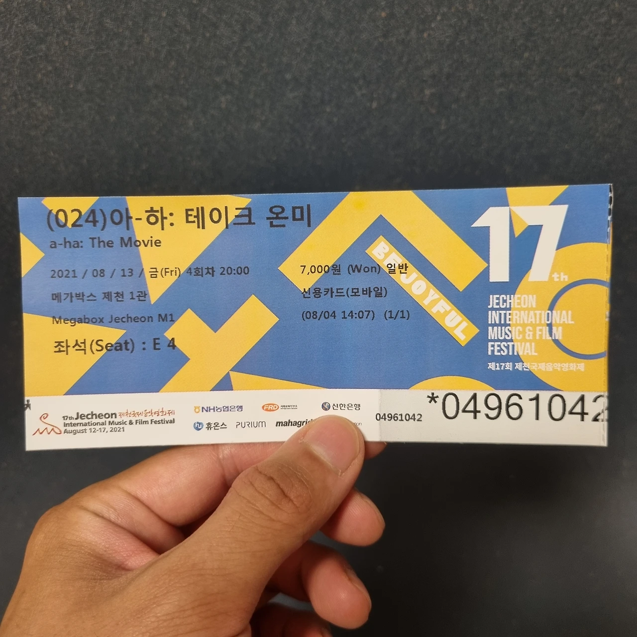 외벽을 온통 노란색으로 칠하고 내부는 20세기말스런 인테리어의 제천 메가박스에서 총 4편의 영화를 봤다.뉴욕의 다양한 버스커들을 인터뷰하며 그들의 삶을 바라보는 <타임 투플레이; 뉴욕 버스커에 관하여>, 영화제에서 볼 수 있는 단편집인 <한국 음악영화의 오늘-2>, 테이크 온 미로 유명한 밴드 아하(a-ha)의 음악적 자취를 따라간 영화인 <아-하: 테이크 온 미>, 마지막으로 유명한 락밴드가 고향에서 공연하기를 바라며 천 명의 락커들이 합주하는 내용을 다룬 다큐멘터리 <천 명의 락커, 하나의 밴드>가 있었다. 두 편의 다큐는 영화적인 재미보다는 버스킹 문화와 락커들의 열정을 확인할 수 있는 정도였고 단편영화집은 총 4편을 상영했는데 상영관 의자에 앉으면서 항마력이란게 필요할 정도로 만듦새가 조악했다.