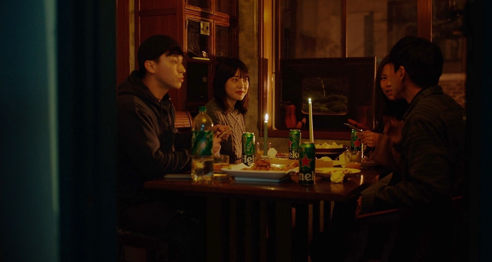 이틀 전 남자친구와 헤어진 지현을 (작업실 친구들과 진행하는) 연말 파티에 초대한다. 괄호 안에 내용은 미리 언급하지 않았다.