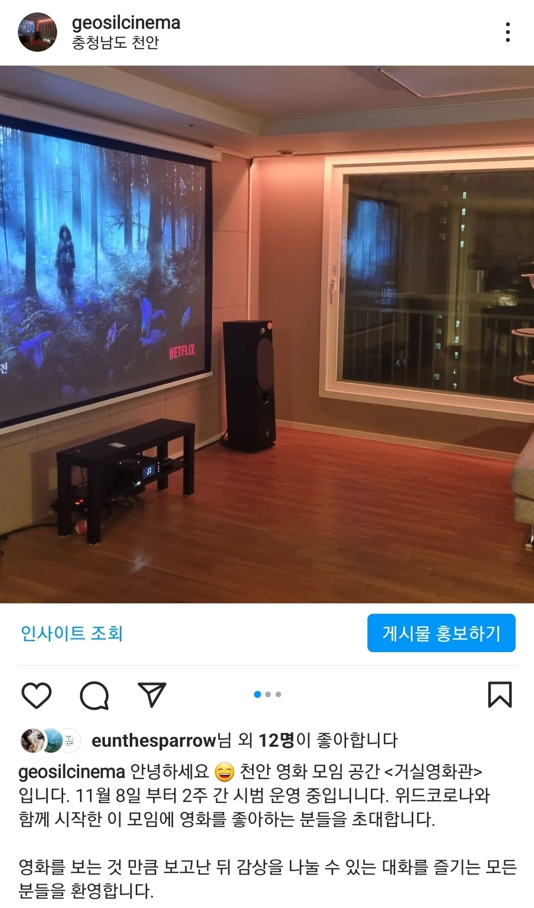 전용 계정(@geosilcinema)을 만들고 영화나 영화 커뮤니티 관련 계정을 팔로우했습니다. 많지는 않지만 관심 있을만한 지인 분들과 맞팔을 하기도 했고요. 첫 번째 피드로 11월 8일부터 2주간 시범운영을 한다는 공지와 어두운 조명의 거실영화관의 사진을 올렸습니다. 좋아요를 10개도 받지 못 했습니다. 당연한 일이죠. 이틀 동안 다섯 개 이상의 피드를 올리면서 반려묘인 꿍꿍이와 돌돌이를 소개하는 글이나 제가 만든 요리 중 잘 찍힌 사진을 올리면서 다이닝 파티 안내를 했습니다. 2021년 11월 12일과 17일, 기념할 만한 첫 번째 공개 모임 공지를 올렸지만 아무런 반응이 없었습니다. 돌이켜보면 이때의 저는 인스타 피드를 올리면서 해시태그 하나도 올리지 않은 초짜 SNS 마케터였습니다.