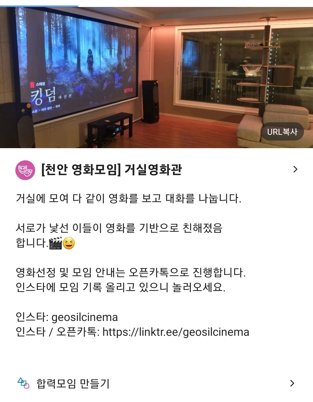 저는 <거실영화관>을 시작하면서 후자를 지향하였습니다. 그렇기에 관계 맺기에 치중하는 '소모임'은 제가 지향하는 바와 맞지 않는다고 생각했습니다. 하지만 지방 특성상 이용할 수 플랫폼이 제한되어 있고 소모임은 비교적 전국적으로 활성화되어 있는 플랫폼이기에 궁여지책으로 활용할 수밖에 없었습니다. 효과는 바로 나타났습니다.