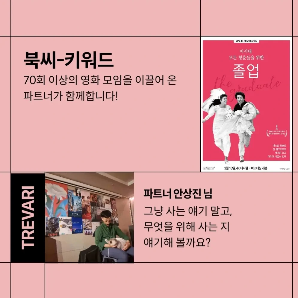 독서모임 커뮤니티이자 현재 재직 중인 트레바리 파트너에 지원했고 다행스럽게도 합격하여 바로 모임을 오픈할 수 있었다. 책과 영화를 같이 본다하여 북씨(Book-Ci)라는 카테고리에 키워드(Key Word)라는 부제가 붙었다. [북씨-키워드]. 처음에는 고전 영화를 함께 볼 수 있는 모임을 하고 싶어 [북씨-클래식]으로 하고 싶었으나 고전이 과연 매력적으로 느껴질까 걱정되어 조금 비틀었다. 모임을 하고 나면 다양한 대화를 주고 받으면서 인사이트를 얻지만 끝나고 오는 길에 무슨 대화를 했는지 정리가 안 될 때가 많다. 그래서 시작과 끝을 한 단어로 하는 건 정리할 수 있는 모임을 만들면 어떨까라는 아이디어에서 출발한 클럽이다. 영화는 애초에 생각했던대로 고전 위주로 <졸업>을 골랐으며 책은 상대적으로 쉽게 읽히는 <노르웨이 숲>으로 첫 책으로 했다. 비슷한 맥락으로 영화는 고전, 책은 잘 읽히는 것으로 했으나 영화가 고전이 아닌 경우, 책을 잘 안 읽혀도 메시지가 깊은 걸로 했다.