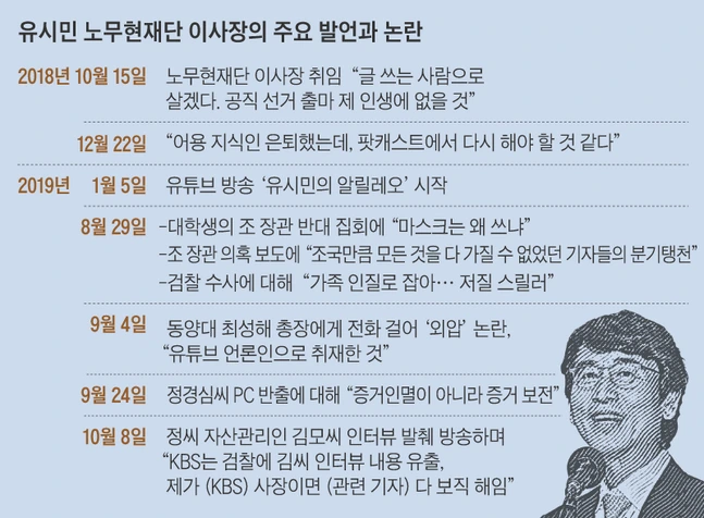 하지만 노무현 재단 이사장 취임 이후 그의 말은 우스워졌다. '노무현 재단'의 사업 일환이라는 '유시민의 알릴레오'를 시작했고, 끊임없이 정치적인 발언을 날렸다. 조국 정국이 시작되자, 조국 전 법무부 장관을 보호하는 발언을 서슴없이 했다.