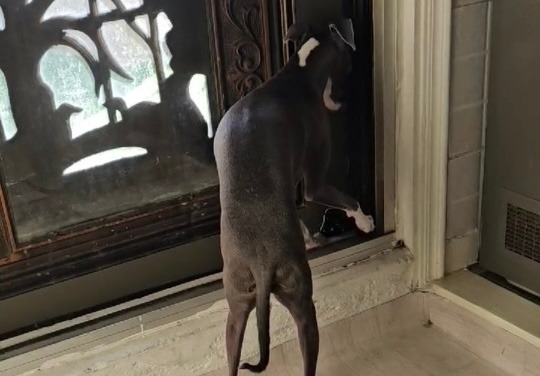 샤샤를 집안으로 우겨넣고 문을 닫으니, 샤샤가 운다.