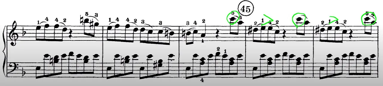 전체적으로 크레셴도(점점 크게)로 가는 것도 지키는 와중에 오른손의 강약도 동시 지키는 것이 힘들었다. 원래 잘 쳤던 왼손의 연속 스케일 부분도 버벅되다가 결국 방향을 잃어버리기까지 했다. 그러나 다행히도 금방 회복하고 강약 조절에 집중할 수 있었다