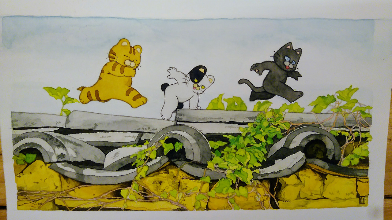시크, 네로, 금동이가 시골 기왓장 위를 뛰어다니는 컨셉입니다. 시크 눈을 채색하다가 붓이 눈 안으로 살짝 들어가는 바람에 화묘점정이 실패했네요.. ㅋ 일주일에 한 두번 많은 시간을 투입하지 못하다 보니 늘 수채화 하나를 완성하는데 많은 시간이 걸립니다. 한 달에 하나씩은 그려내고 싶은데... 흐음.. 정밀한 수채화 몇 개를 더 그린 후 조금 심플한 그림을 그려볼까 싶네요~