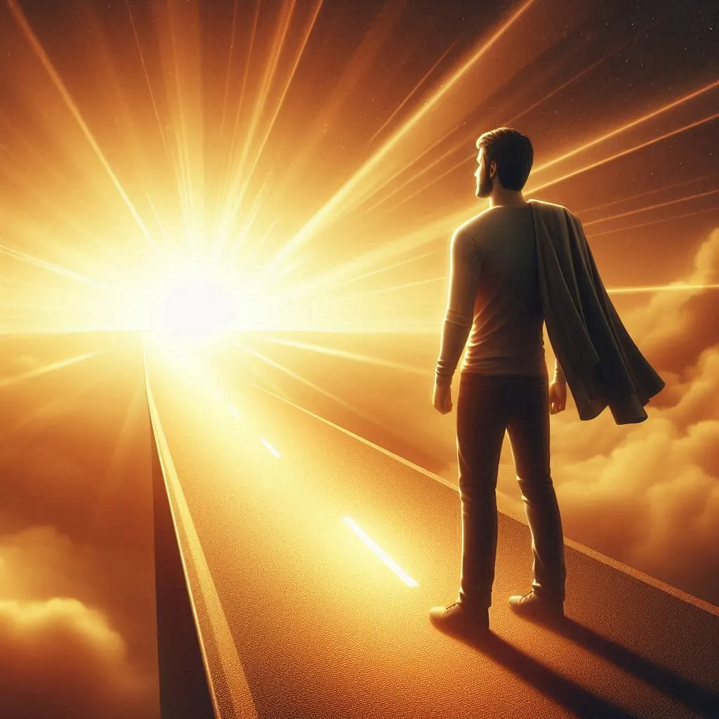 "결단하는 표정의 사람과 시작을 의미하는 밝은 빛"