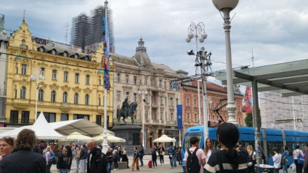 푸른 트램이 지나가는 반 옐라치치 광장(Ban Jelačić Square).