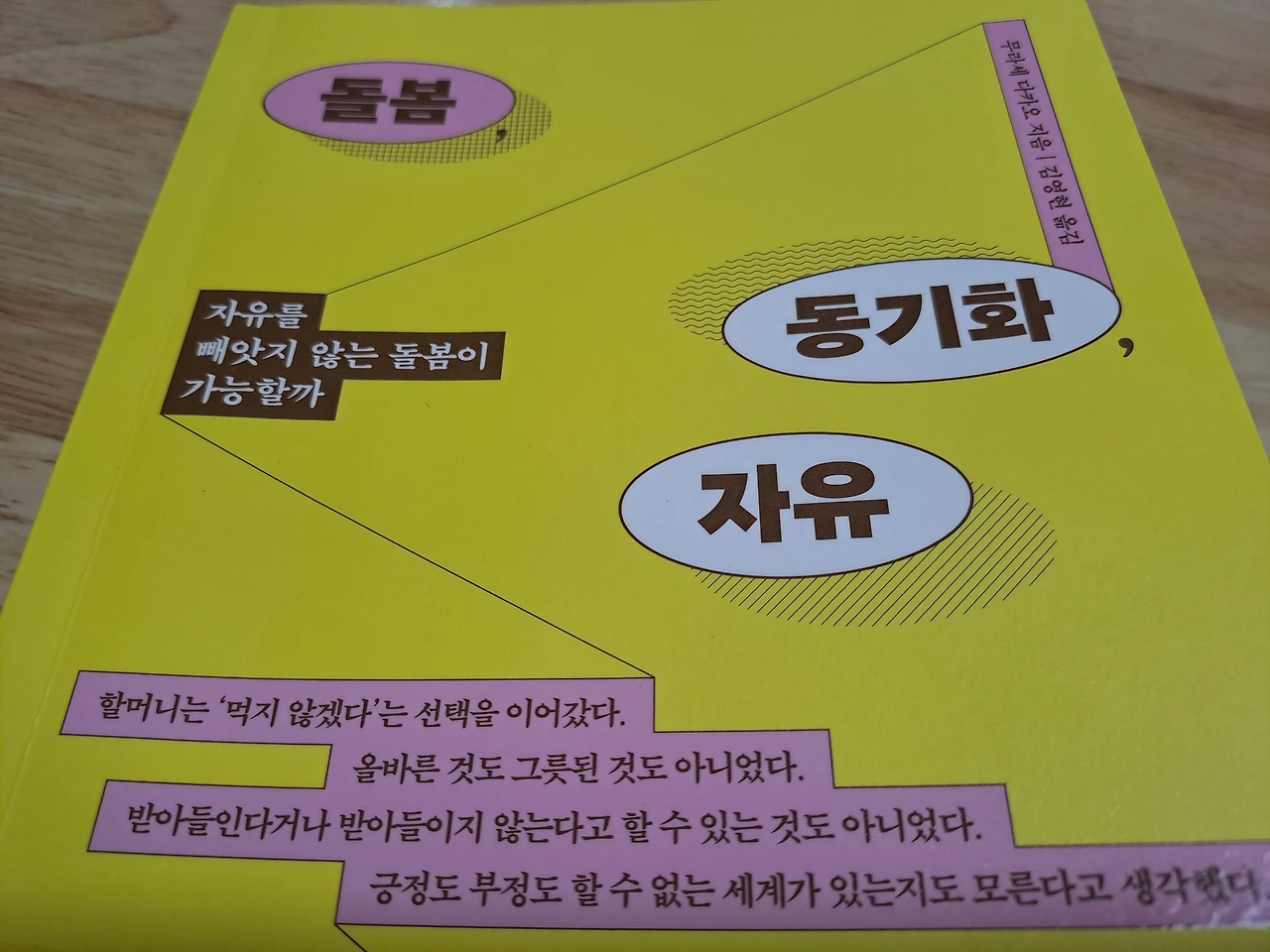 그리고 이 책 <돌봄, 동기화, 자유>는 늙음의 자유와 아름다움을 이야기하는, 실제 요양원을 운영하며 실질적 돌봄사로 활동하는 작가의 에세이다. 따지자면 지구와 안드로메다 은하 사이의 거리만큼이나 될 것 같은 어질어질한 두 작품의 갭 차이에도 불구하고 말하고자 하는 바는 대충 비스꼬름하게 떨어진다. 젊음만이 아름다움의 척도가 아니며 늙음에도 미학이 있다는 것.