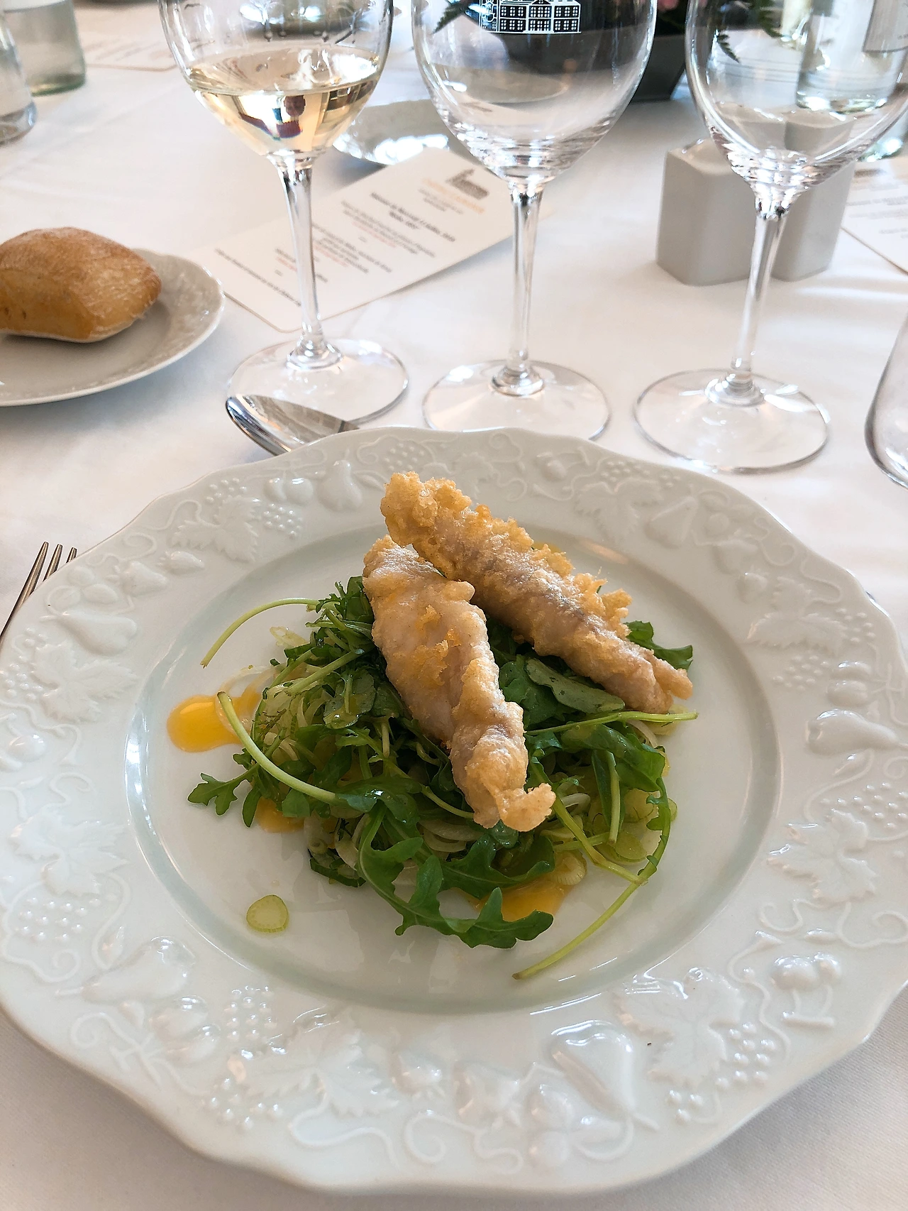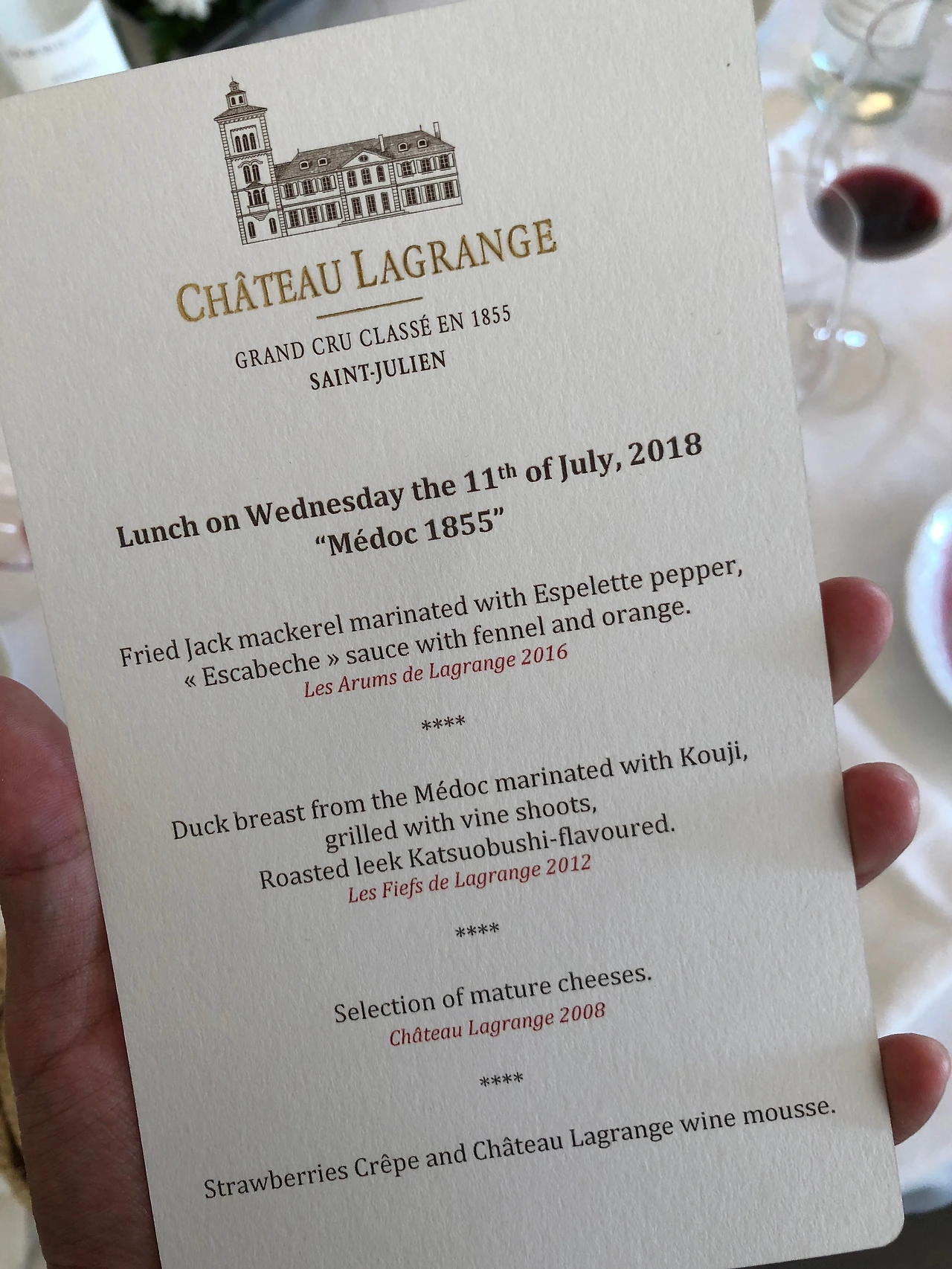 샤또 라그랑주에서 제공한 점심, 이 뒤에 디저트도 있었고 두 세종류의 와인으로 페어링 되었다.