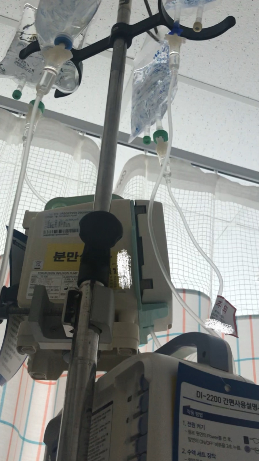 월요일이면 폐 엑스레이가 추가됐다. 트랙토실, 라보파, 마그네슘—출산을 늦추기 위해 가능한 모든 약을 썼다. 하루 종일 링거 줄에 매인 채 침대에 누워 지내는 게 일상이었다. 샤워는 링거 교체일에만, 그것도 10분 이내로만 허락됐다. 임부용 압박스타킹을 신고 벗는 일조차 쉽지 않았다. 저녁 6시가 되면 남편이 들어왔다. 매일 깎아온 사과 한 개, 친정엄마가 직접 만들어 보내주신 검은콩물. 그게 내 하루의 작은 기쁨이었다.