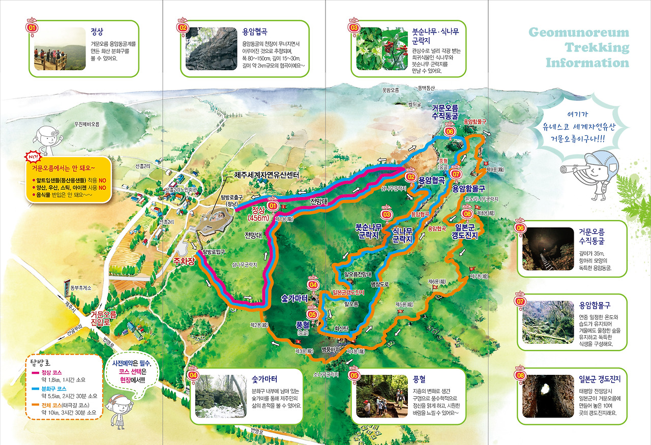 제주를 간다면 한라산, 성산일출봉, 거문오름, 만장굴 이 4개는 보고 돌아오자는 생각을 했다. 한라산 백록담은 다음 기회로 미뤄두기로 했다. 성산일출봉을 여행 2일 차에서 보았고, 3일 차 거문오름과 만장굴을 볼 계획을 하나씩 행하고 있었다. 여행 계획을 세우면서 거문오름 선택이 가장 마지막이었다. 예약시간에 맞춰서 간다는 것을 1차적 어려움이라고 생각하고, 3시간 반 코스에 체력적인 자신감 부재가 2차적 어려움이었다. 하지만 힘에 부쳤다면 1코스에서 아니면 2코스까지만 걸어도 거문오름 탐방은 충분하니 어렵게 생각하지 말고 꼭 가보시라 추천하고 싶다.